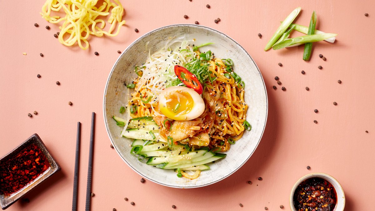 Nudler, gochujang-sauce, hjemmelavet kimchi, crispy ebi, æg, agurk, sesam
