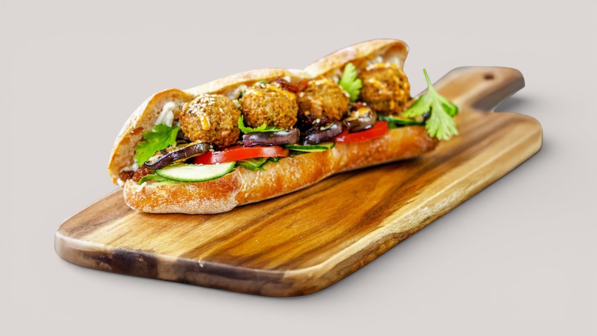 Falafel, vælg mellem pommes frites eller ris, blandet salat, tomatsauce og creme fraiche dressing. Serveres med valgfrit tilbehør, dyppelse og drikkevare.