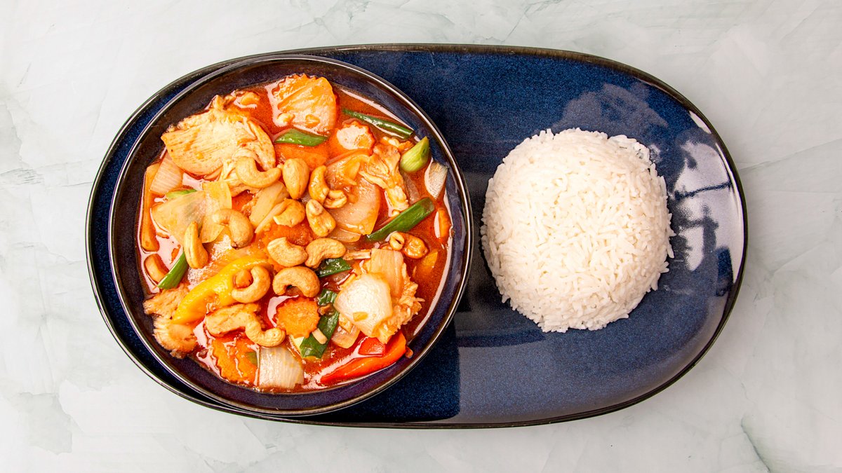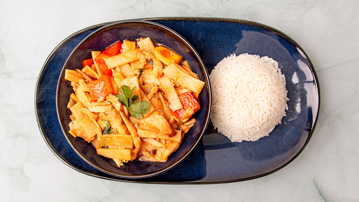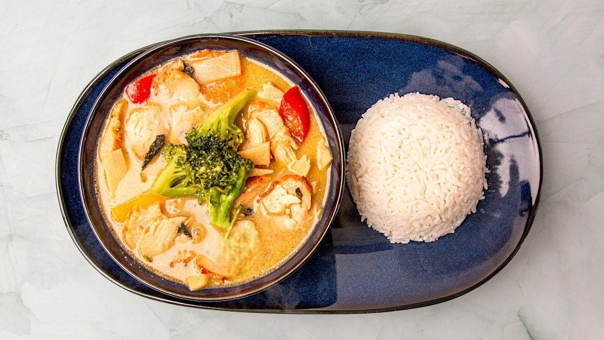 Kylling stegt i rød karry med bambusskud, rød chili og sød basilikum. Serveres med ris.