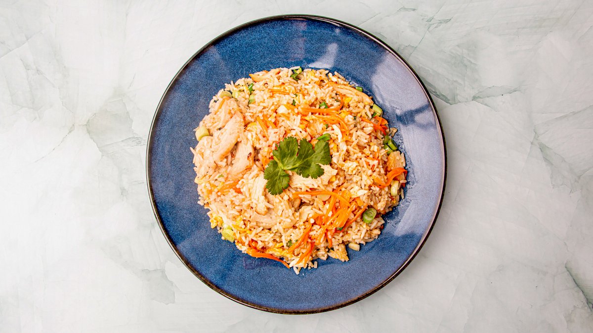 Valgfri protein med stegte ris, æg, gulerødder og forårsløg.