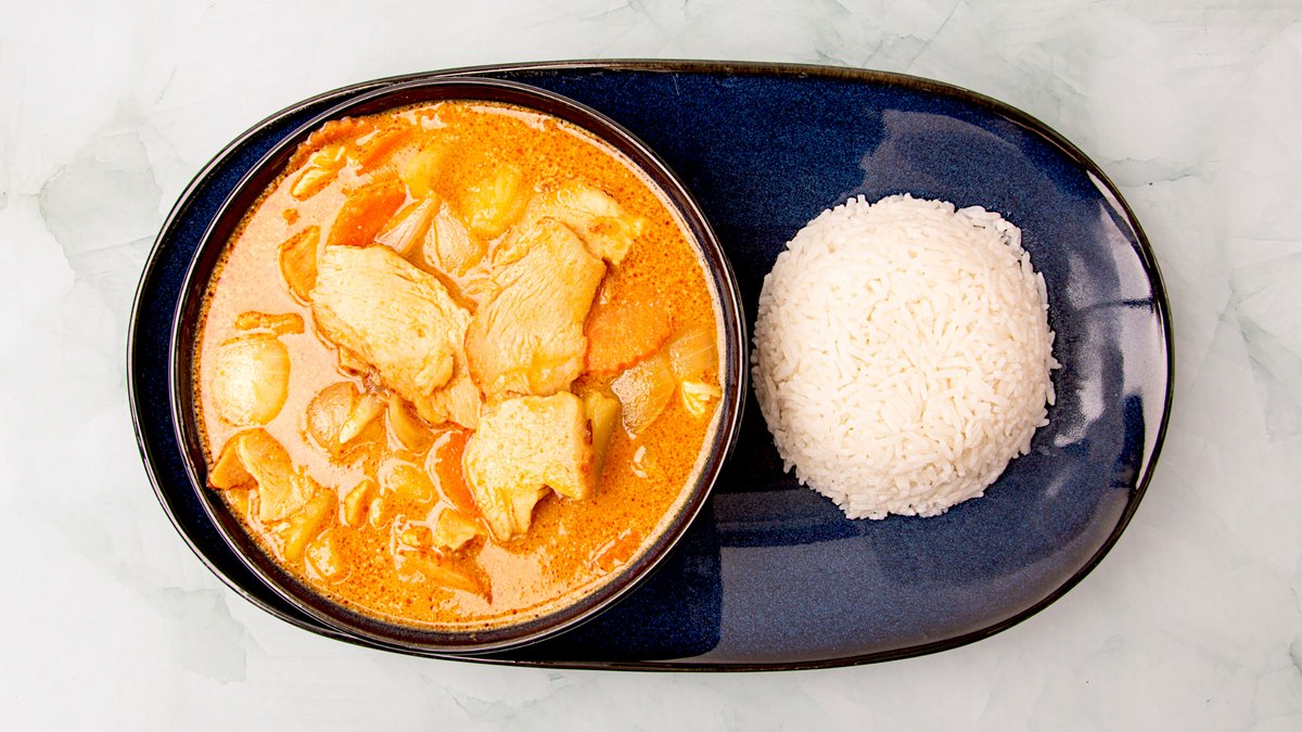 Kylling, kokosmælk, kartofler, gulerødder og løg serveres med ris.