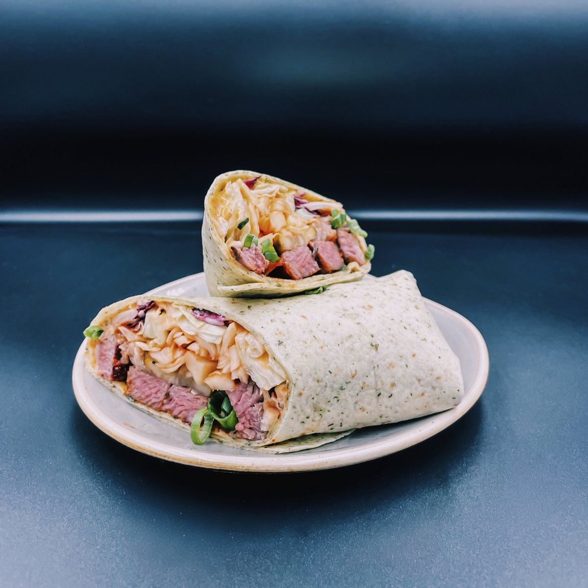 Spinat wrap med Black Angus oksekød, hjemmelavet chilimayo, hoisin sauce, sriracha, kimchi coleslaw, forårsløg og pickles. Serveres med en valgfri drikkevare.