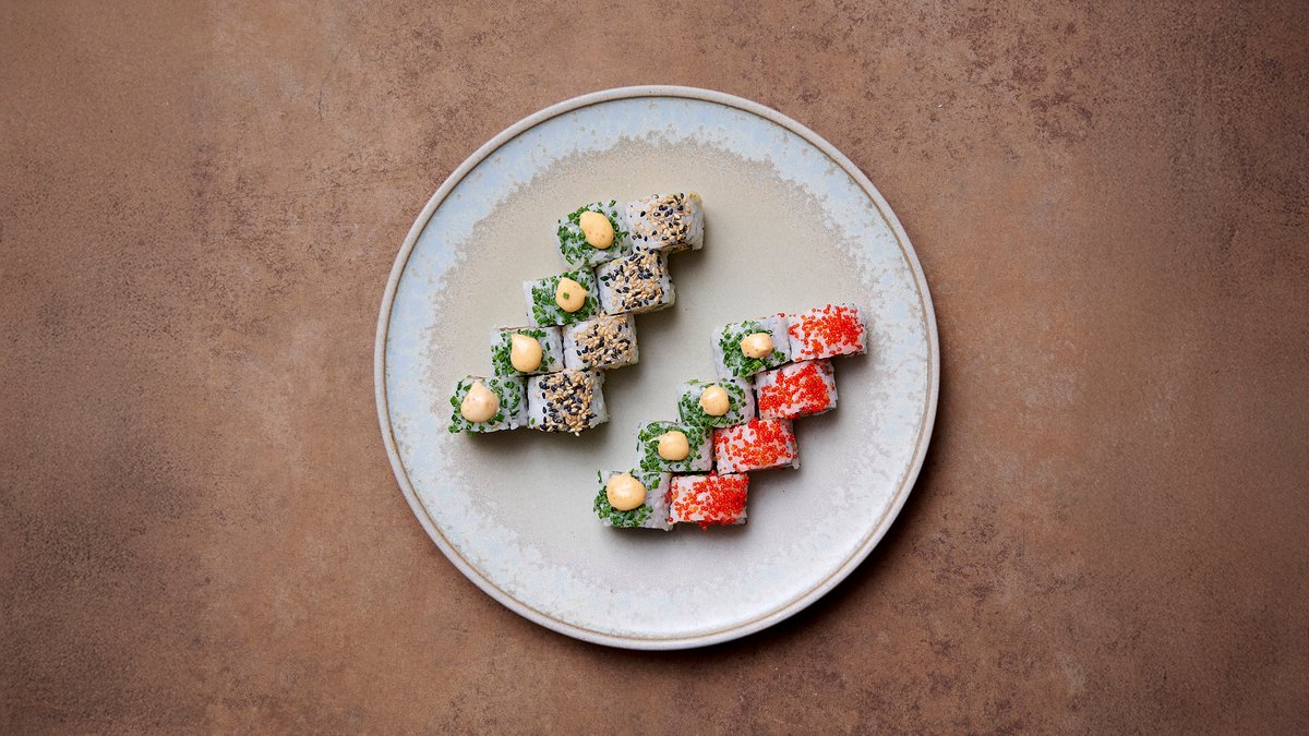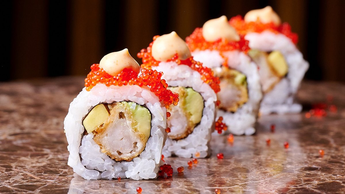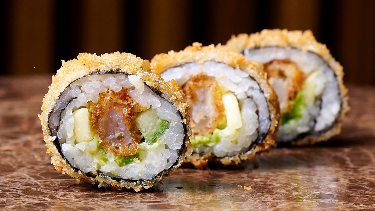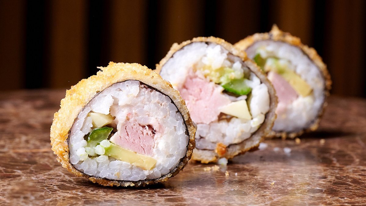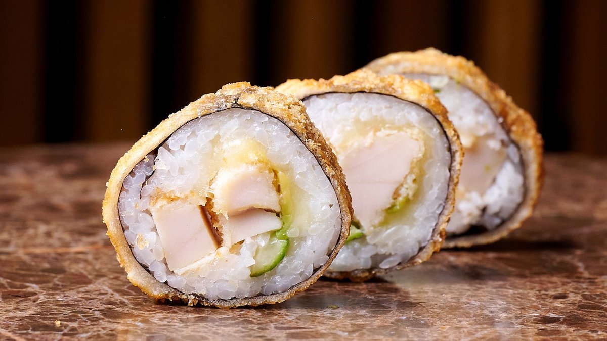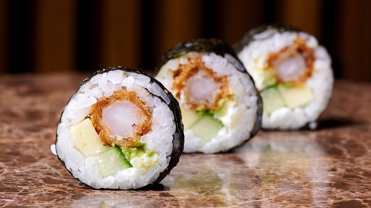 Indbagt reje, agurk og avocado. Toppet med hamachi, teriyaki og forårsløg.