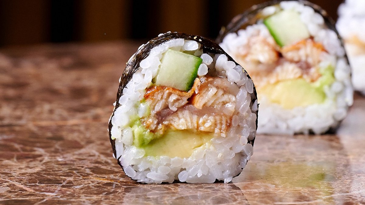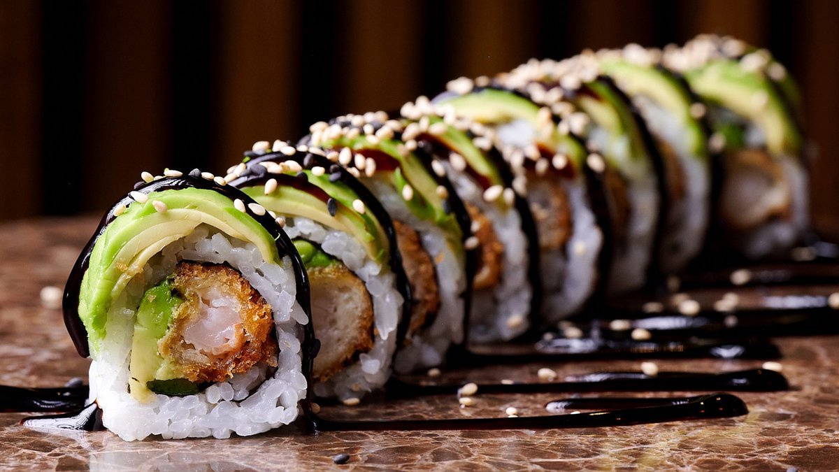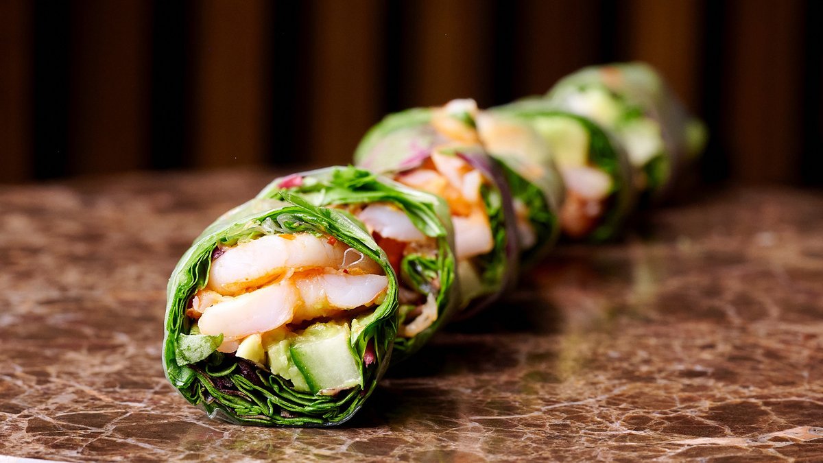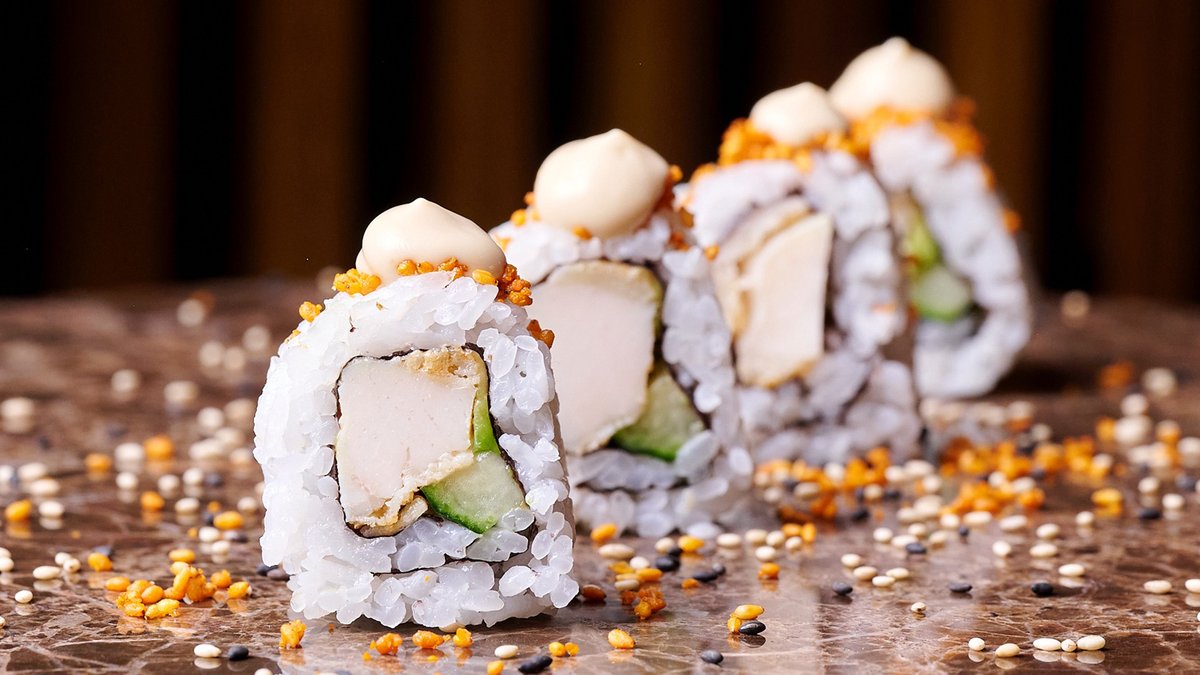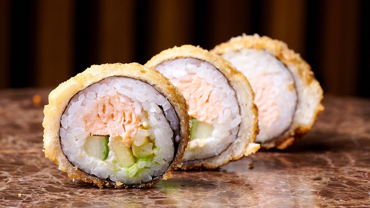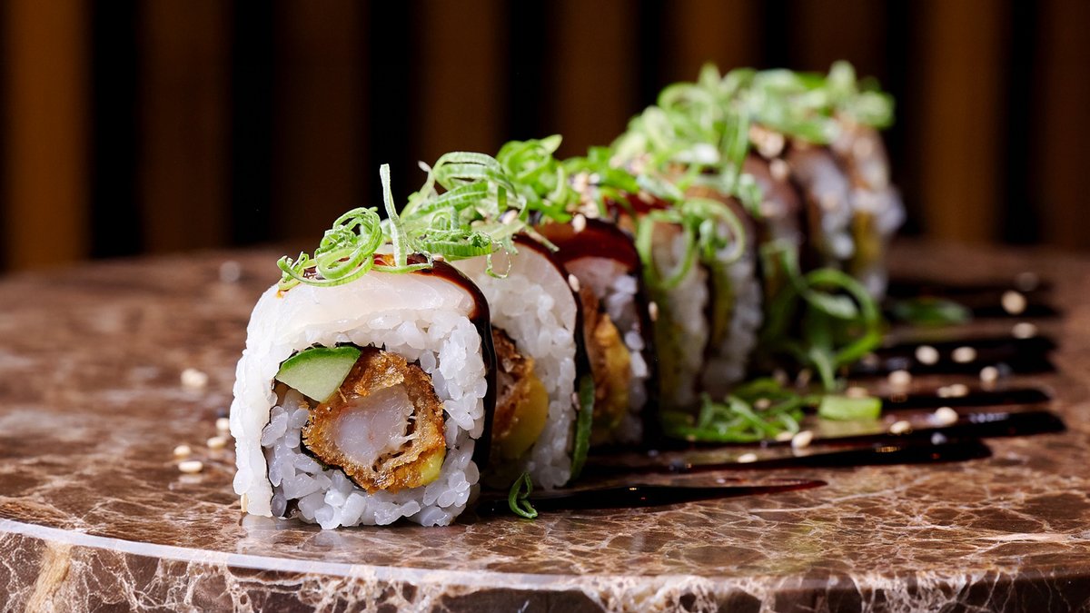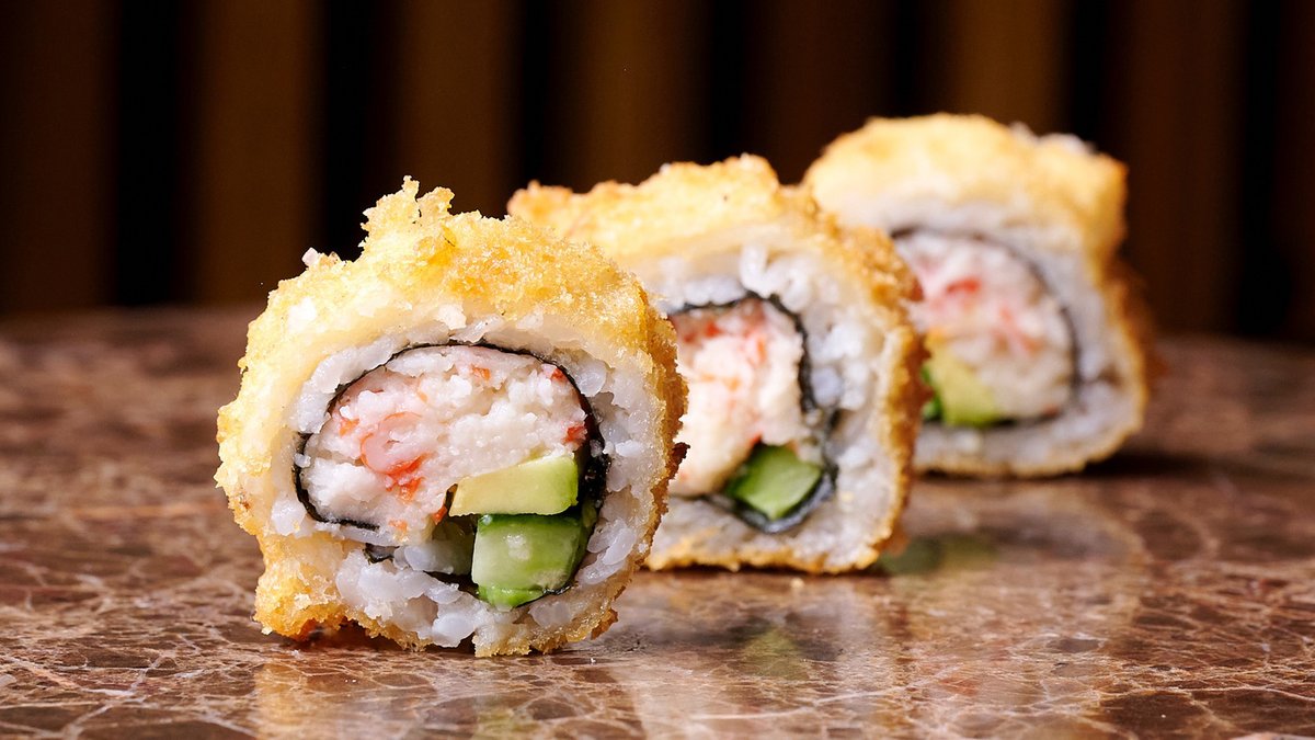 Indbagt reje, agurk og avocado. Toppet med hamachi, teriyaki og forårsløg.