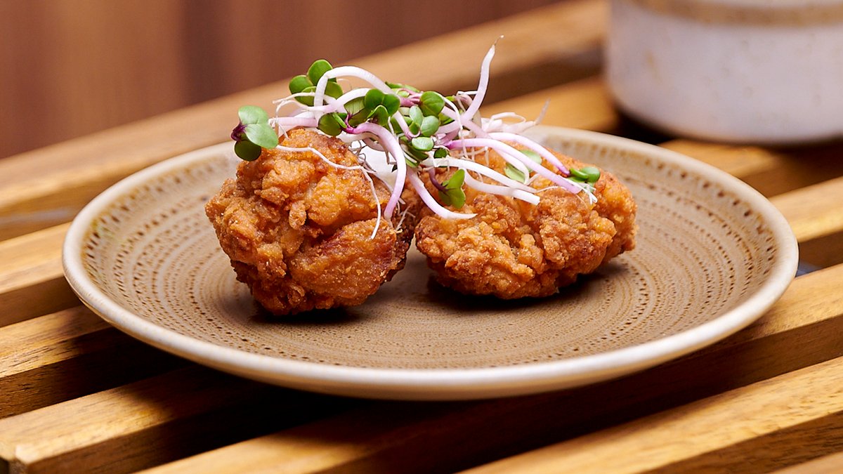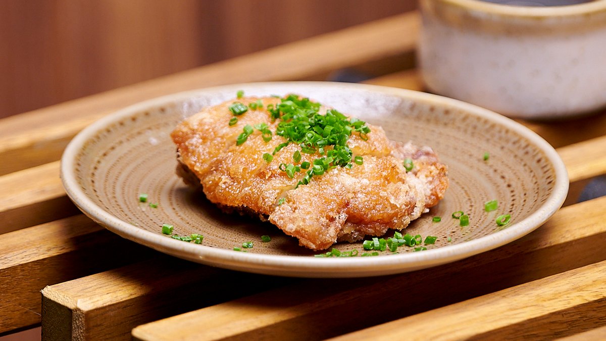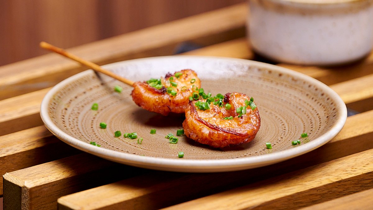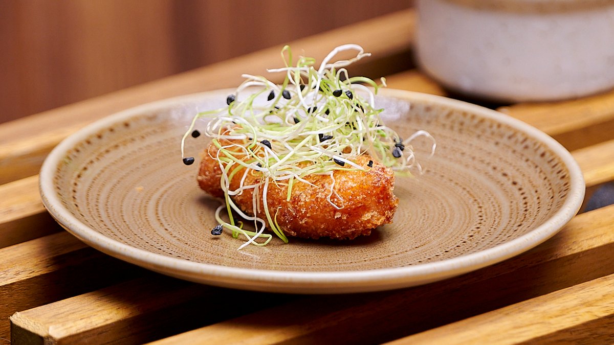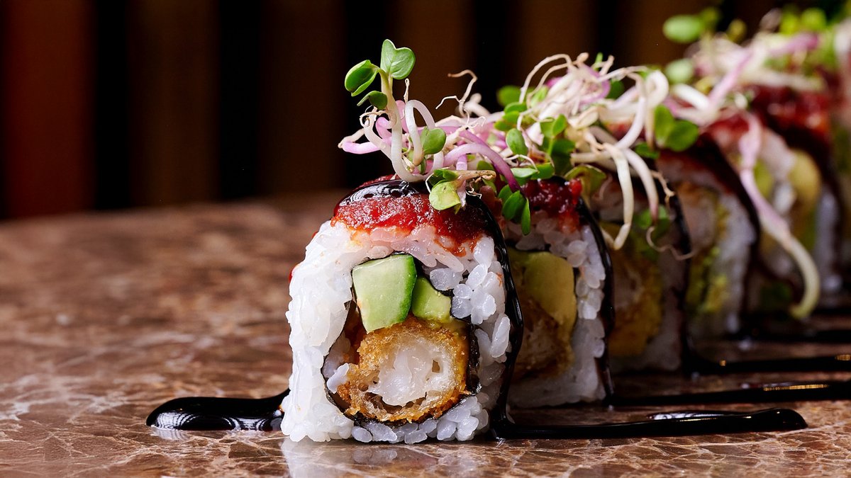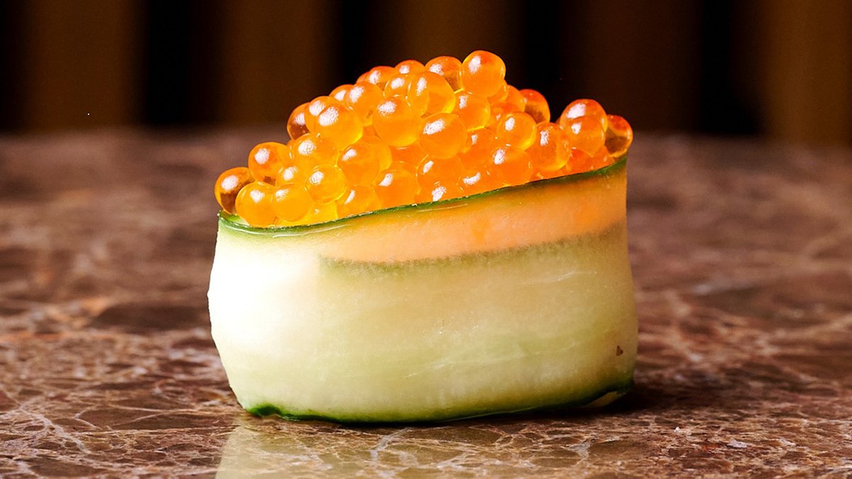 Indbagt reje, agurk og avocado. Toppet med hamachi, teriyaki og forårsløg.