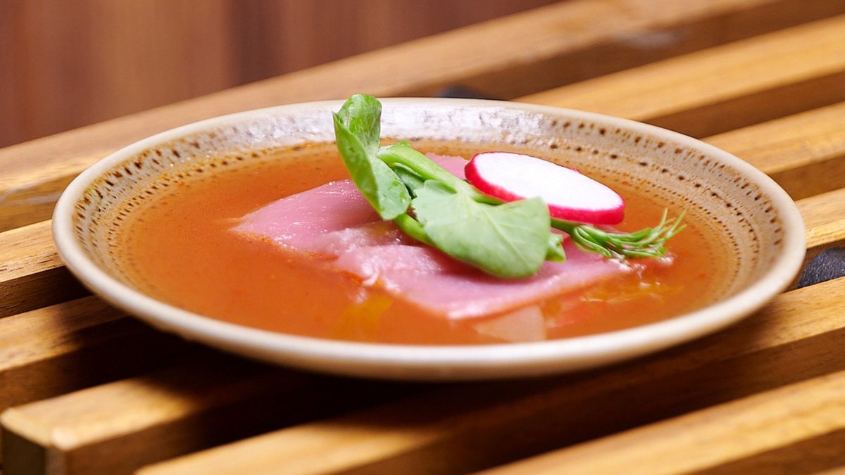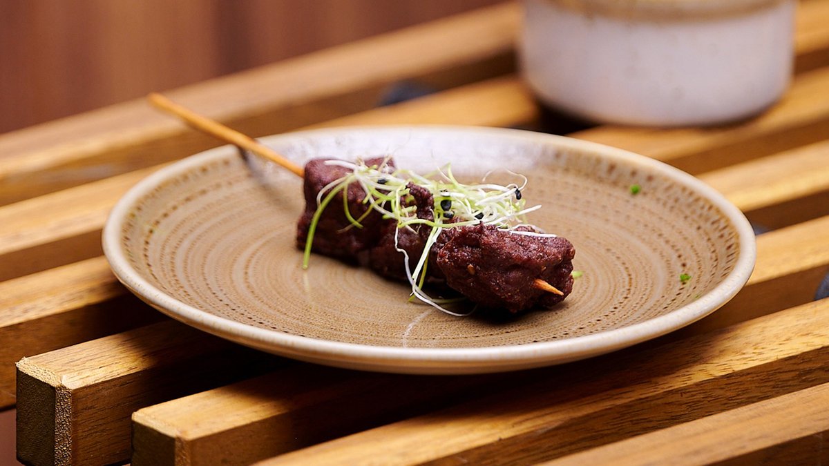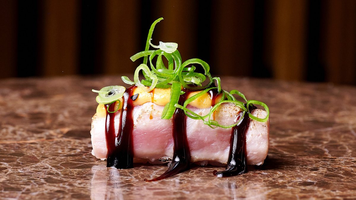 Tempurareje, avocado, agurk toppet med tun tataki og teriyaki sauce