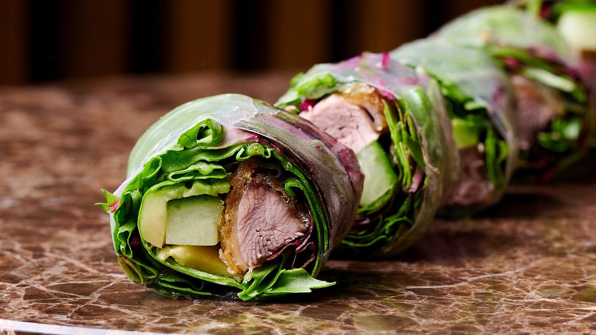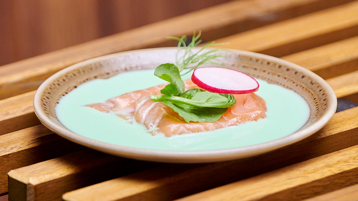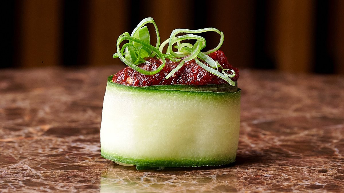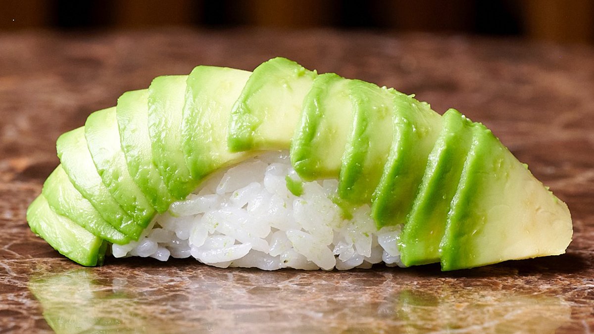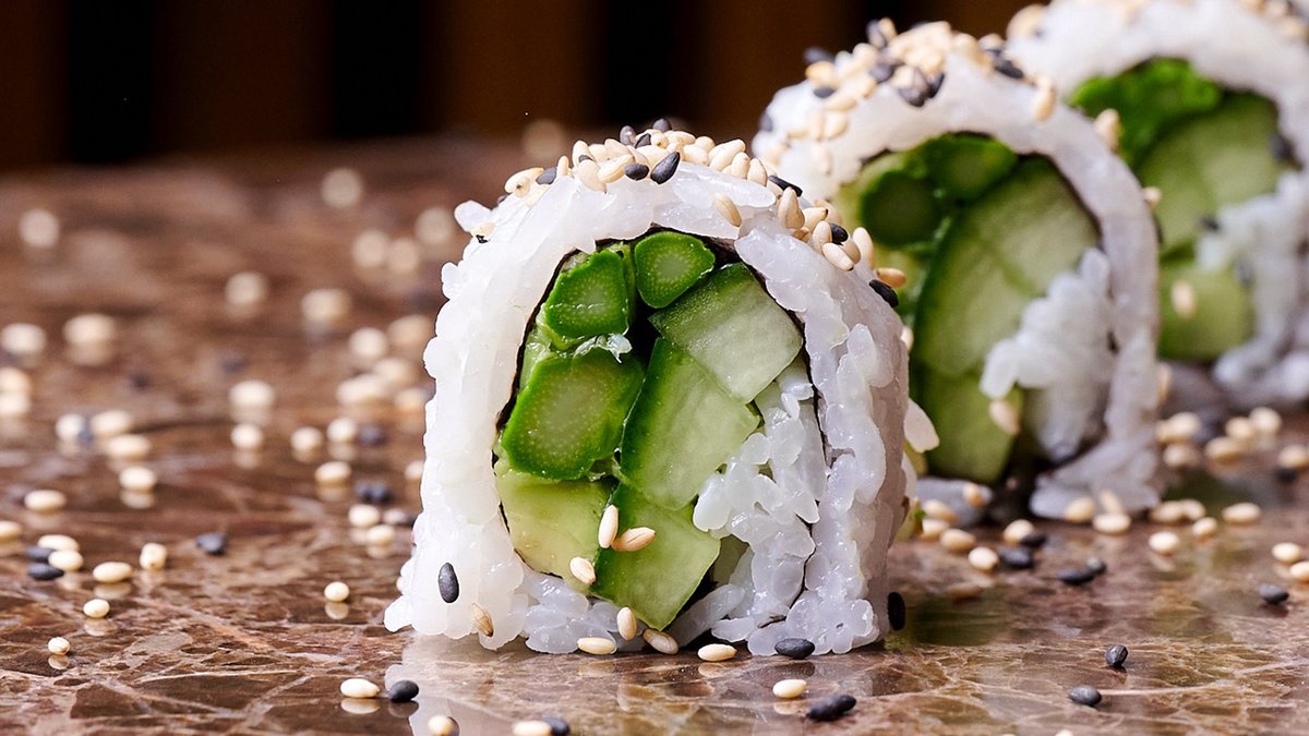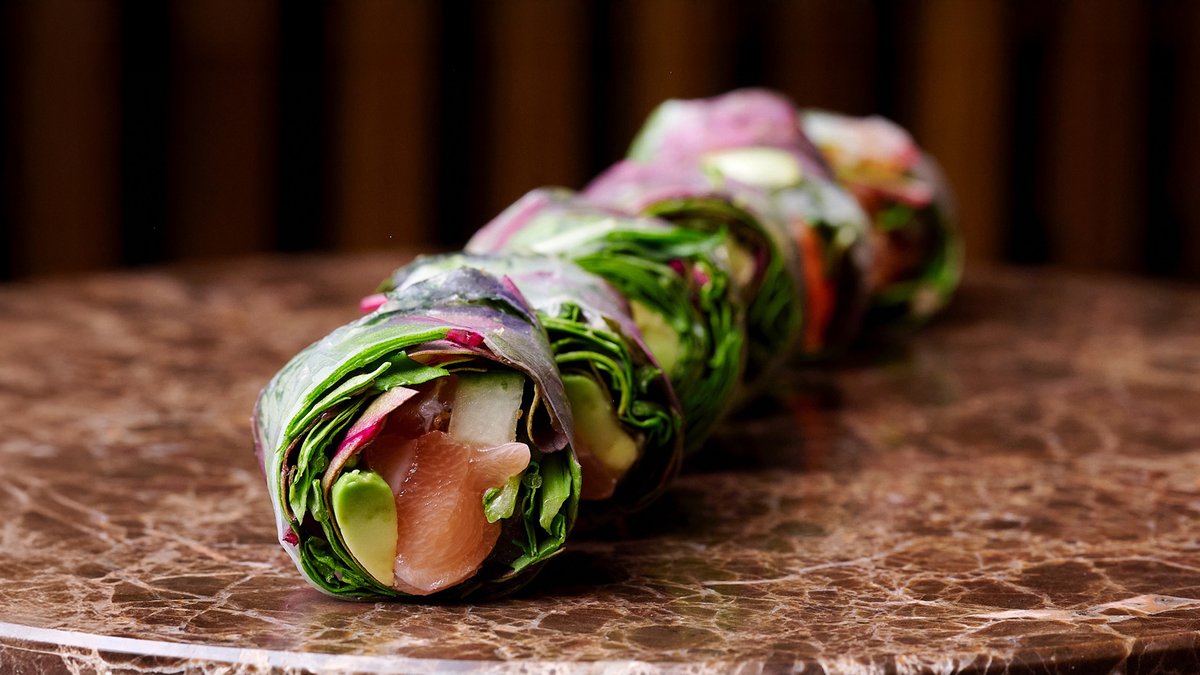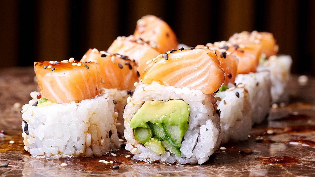 Agurk, asparges og avocado. Toppet med laks og yuzu sauce.