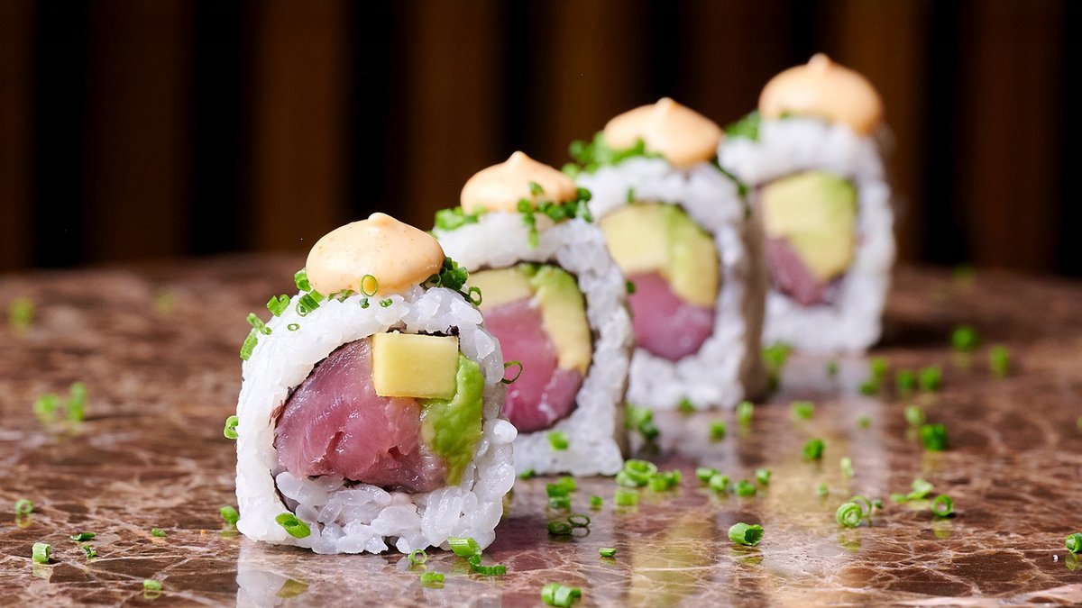 Tempurareje, avocado, agurk toppet med flamberet tun, chili mayo og teriyaki.