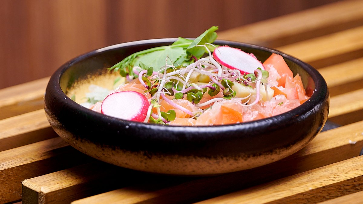 Laks, salat, avocado og agurk, toppet med yuzu sauce.