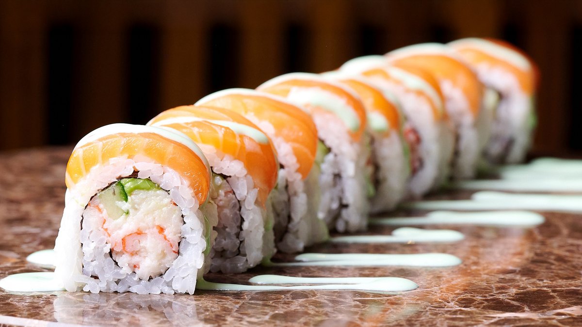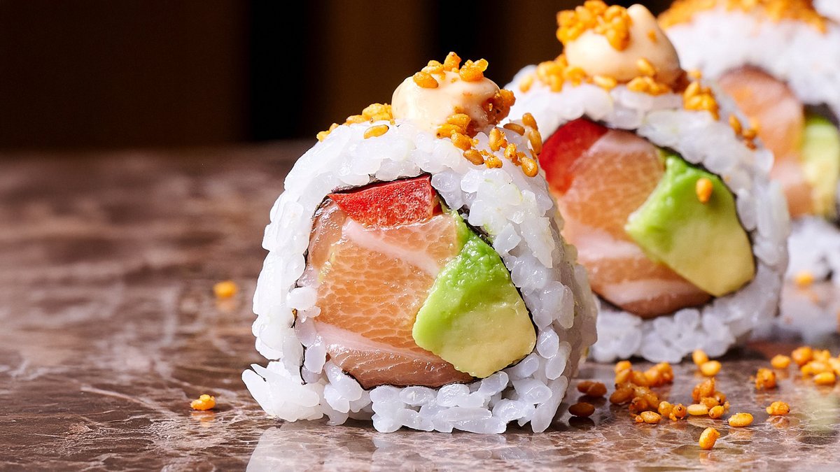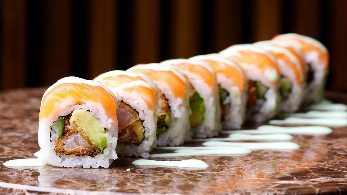 Laks, avocado, flødeost, mango og tobiko toppet med yuzu sauce