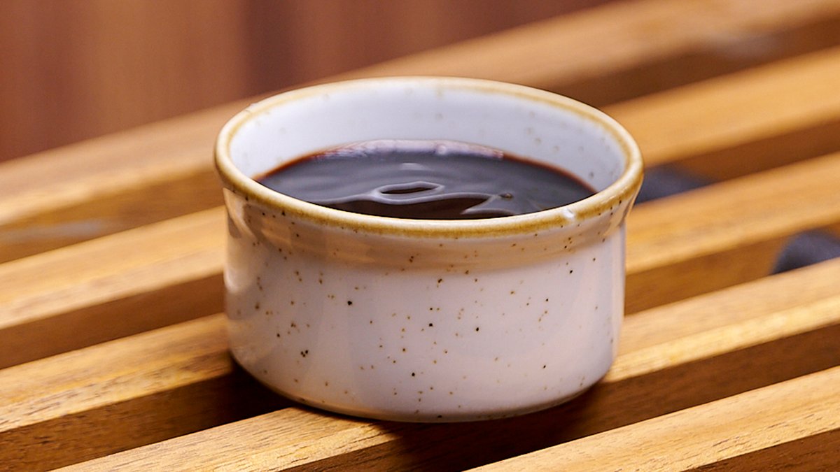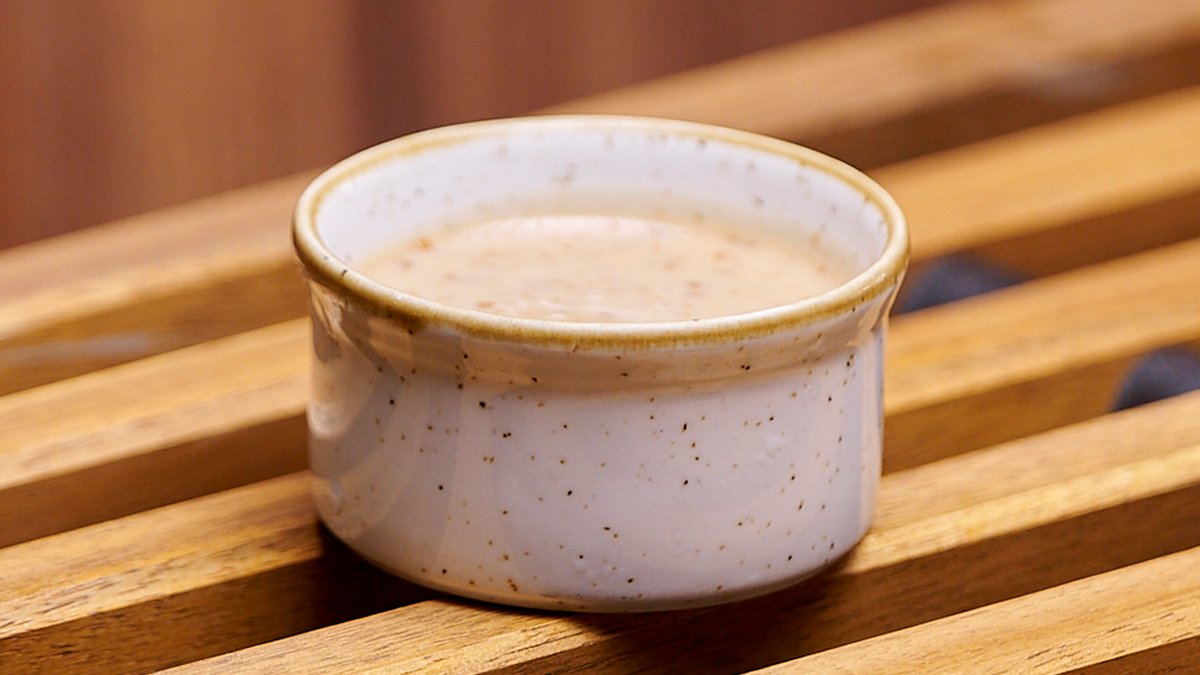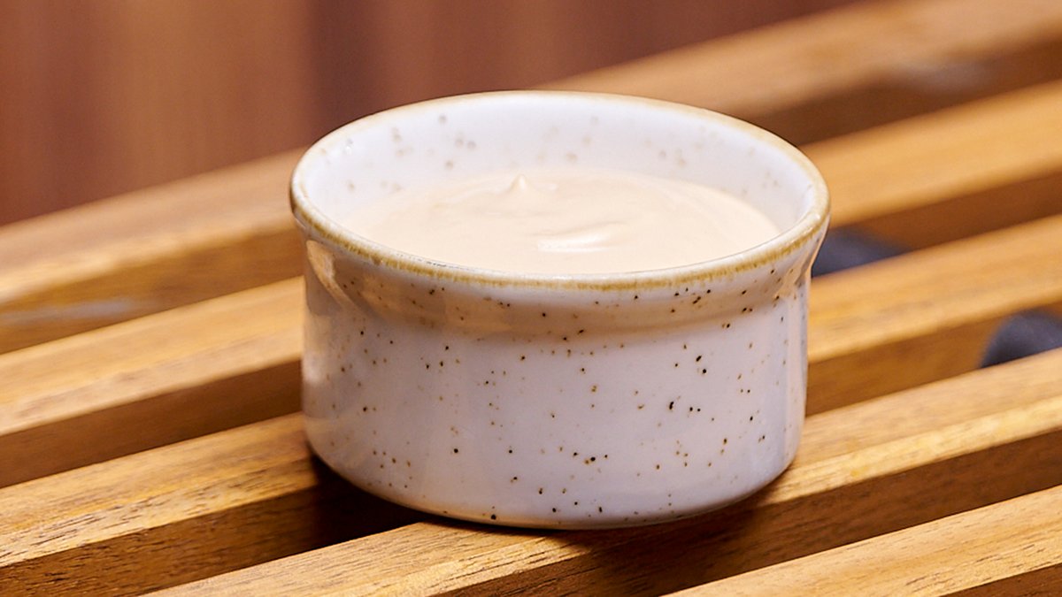 Rå fisk, delt i 5 skiver. Med hjemmelavet sauce til