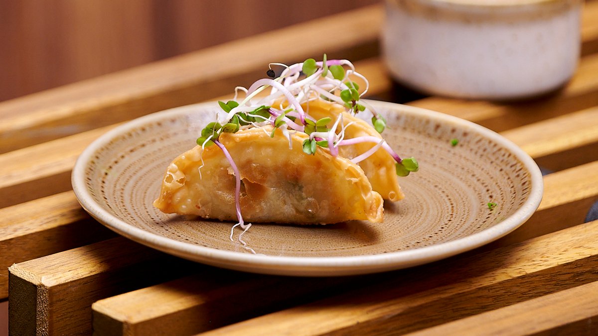 Dumplings med fyld af kylling og grøntsager, med sweet chili sauce til