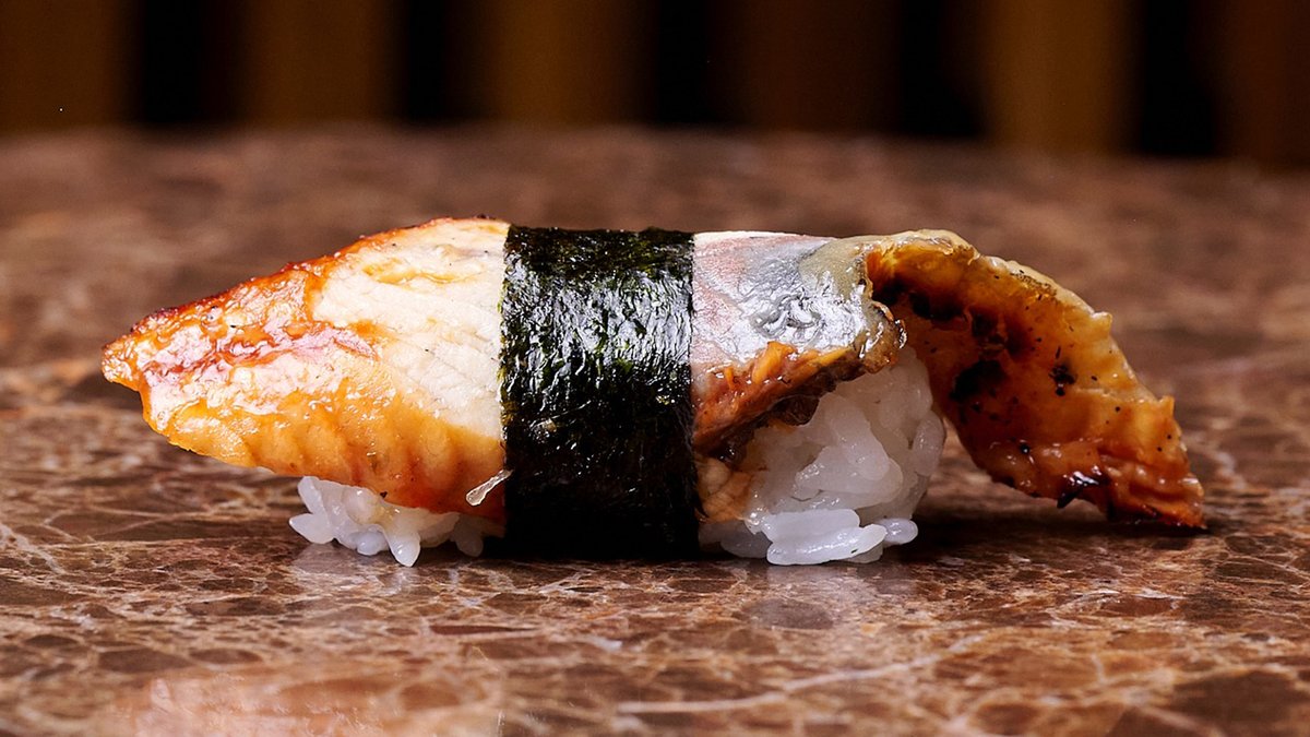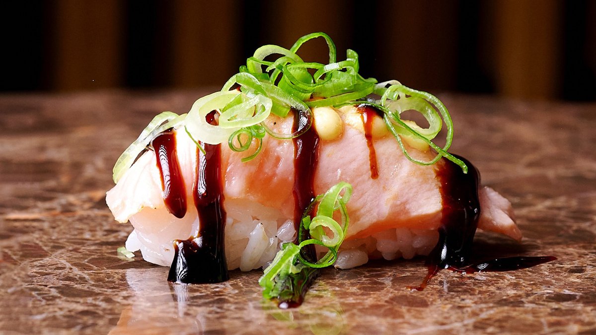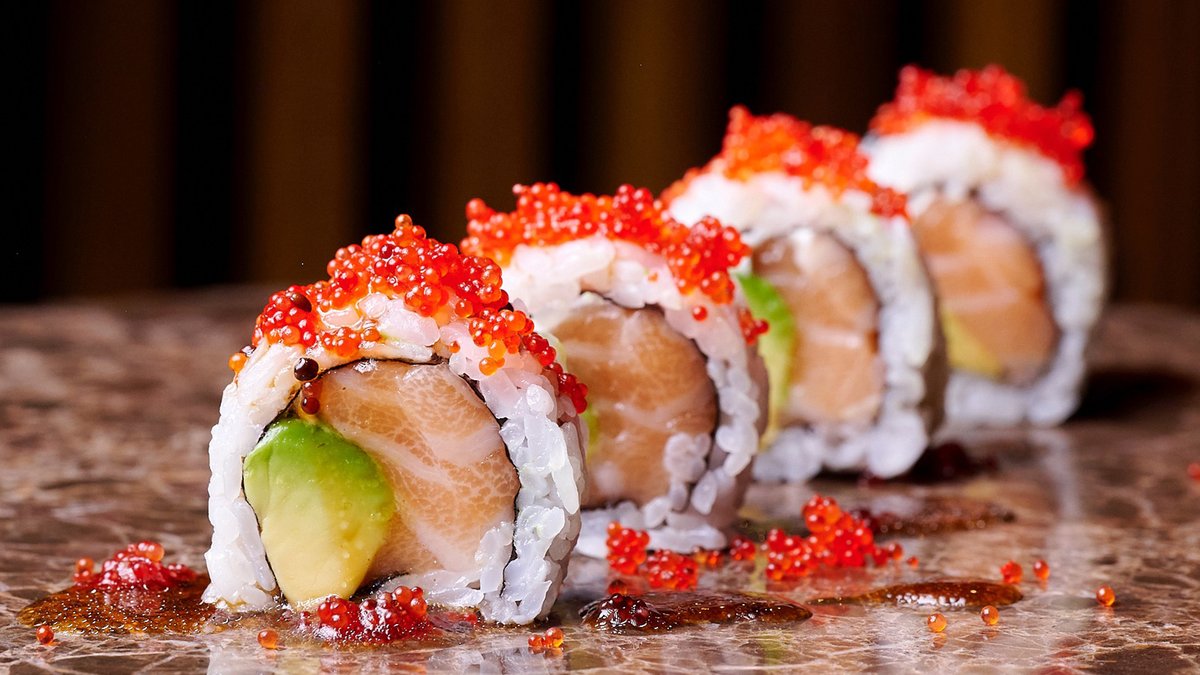 Tun, avocado, laks og tobiko toppet med teriyaki