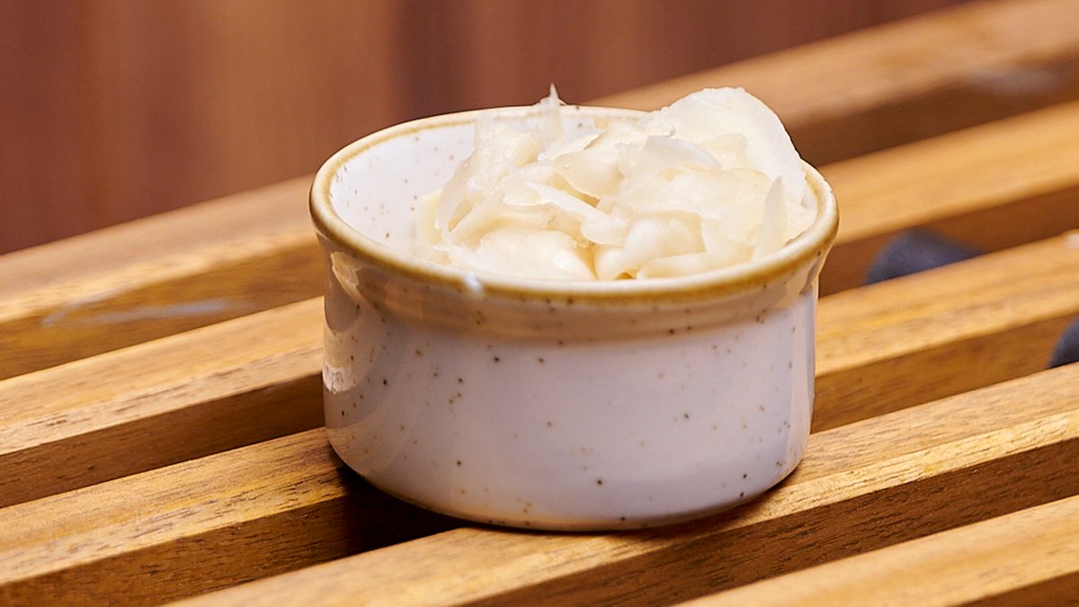 Rå fisk, delt i 5 skiver, med wasabi sauce til