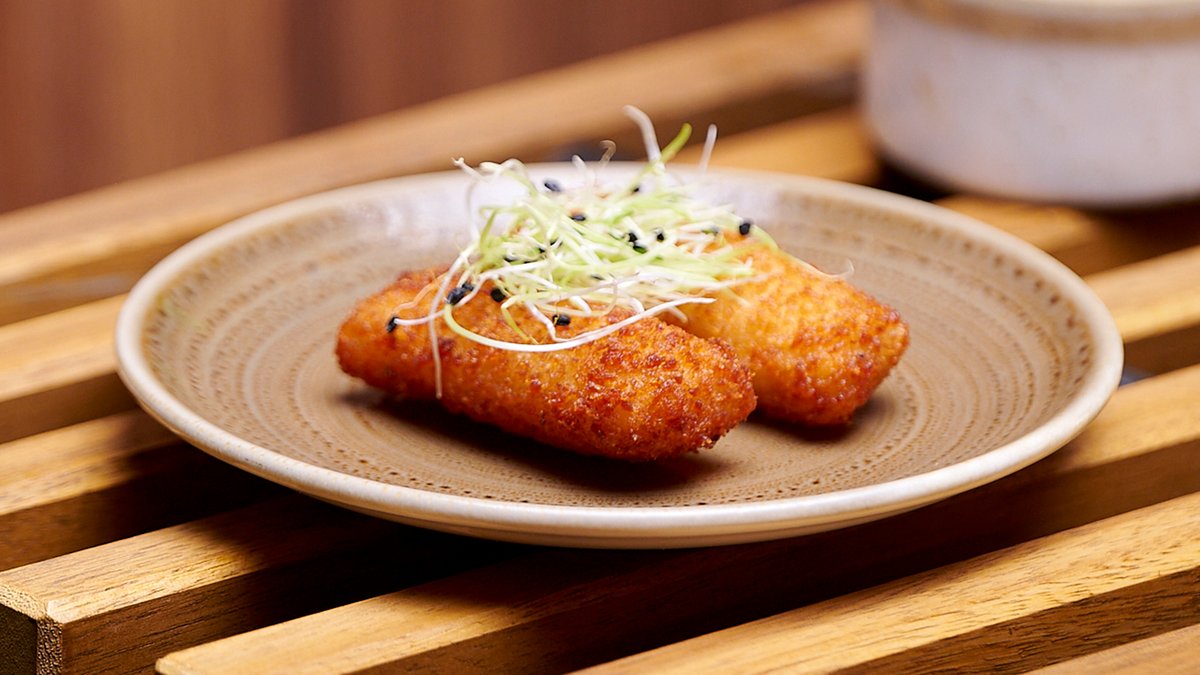 Indbagt reje, flødeost, agurk, mango og avocado.