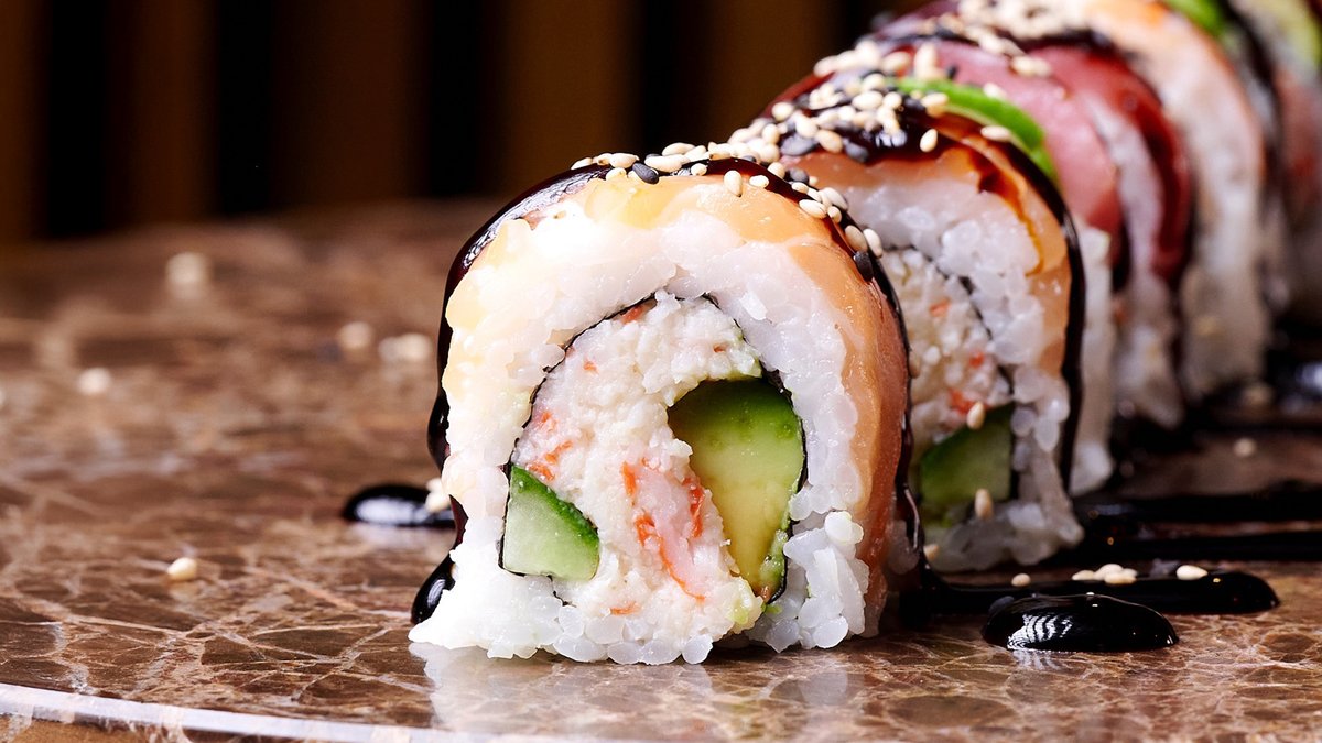 Krabbe, agurk og avocado. Toppet med laks, tun, reje, avocado og teriyaki.