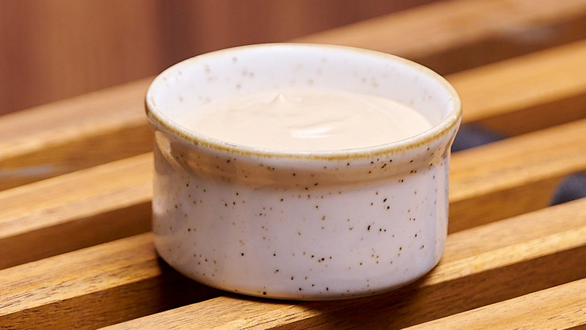 Spyd med kylling og rød peberfrugt, toppet med hvidløgsmayo