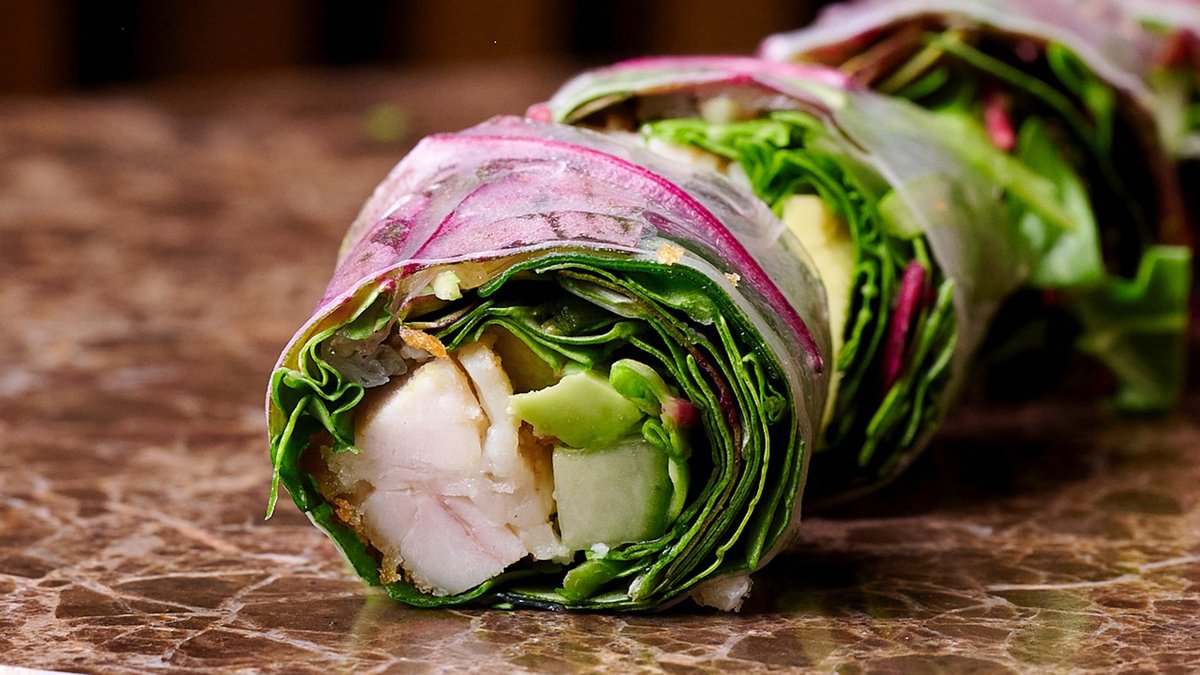 Indbagt reje, avocado, agurk, chilimayo og purløg.