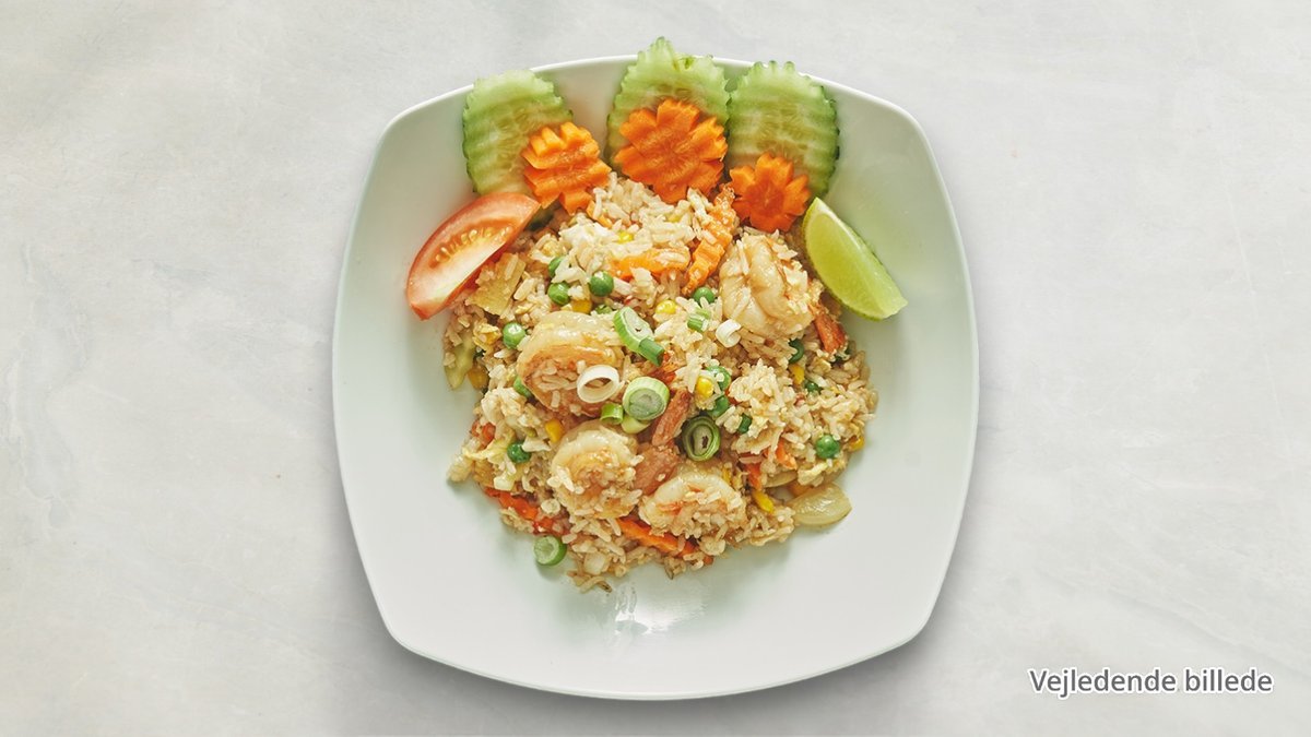 Stegt ris med kylling, løg, blandede grøntsager, soya sauce og æg.