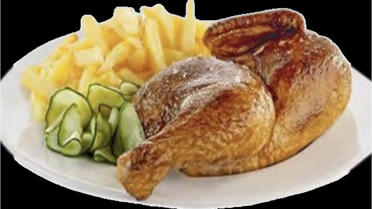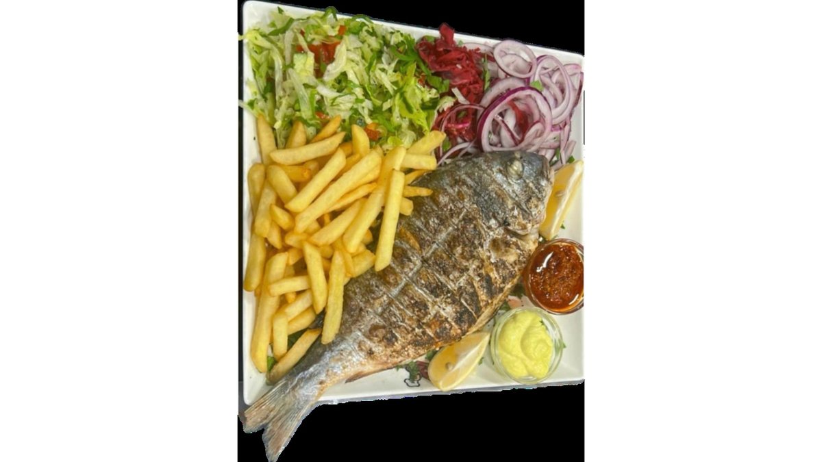 Grillet dönerkød med brød, tomatsauce, smeltet smør, yoghurt og valgfrit tilbehør. Serveres med pommes frites.