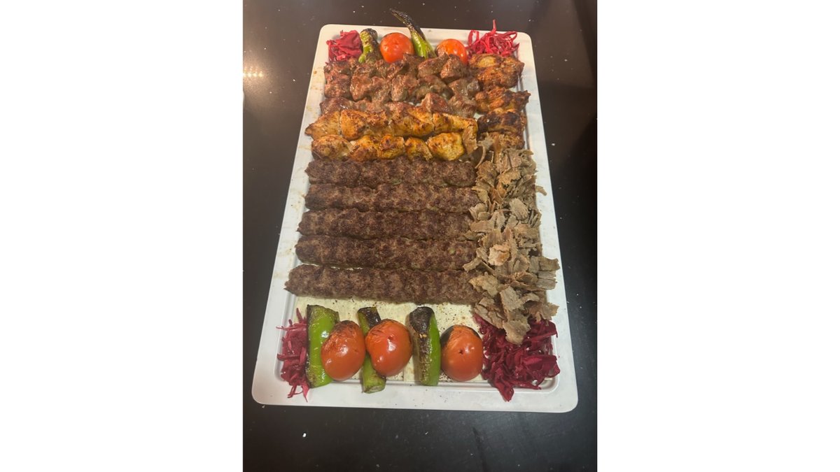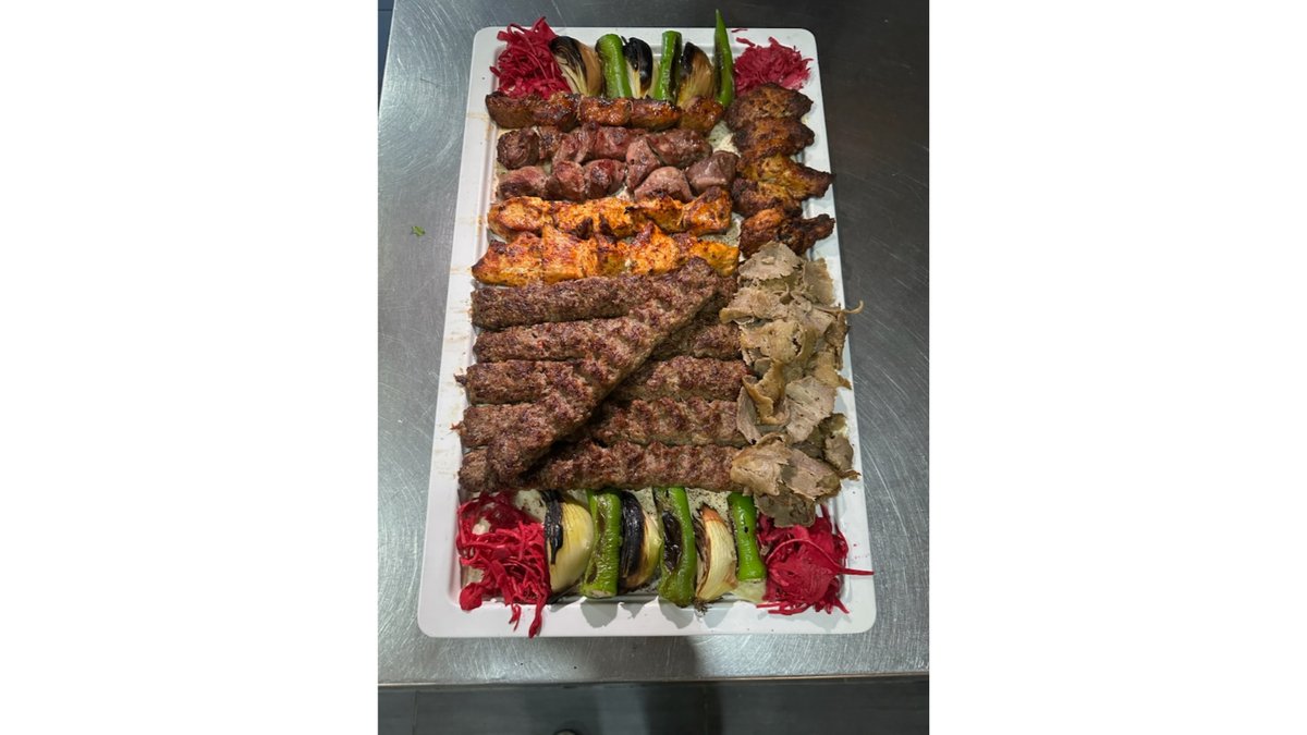 Anbefales til 5 personer. 2 x Lammespyd 2 x Kalvespyd 2 x Kyllingespyd 2 x Urfa kebabspyd 2 x Adna kebabspyd 1 x Kyllingevinger og shawarma. Serveres med hummus, tzatziki, ezme, salat, valgfri tilbehør og brød.