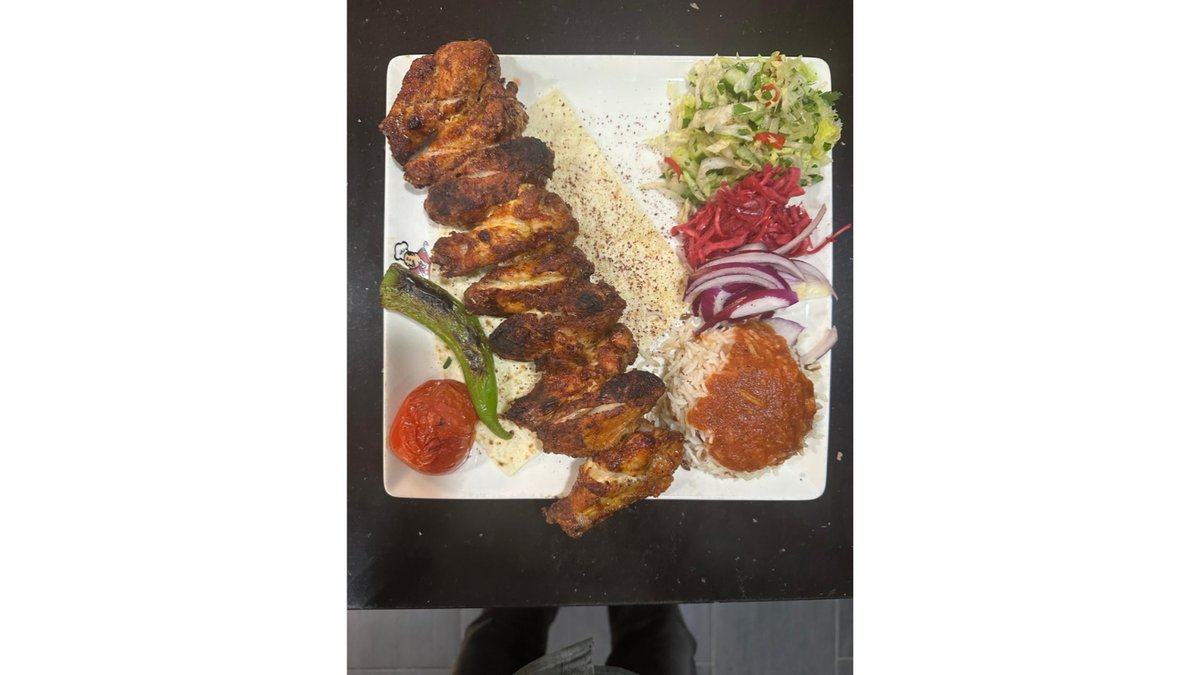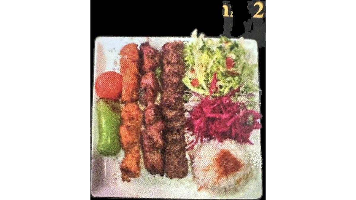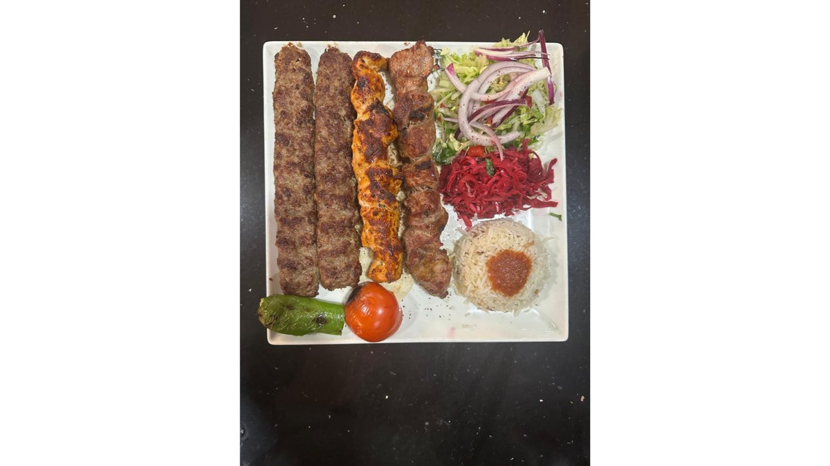 1 x Adan kebabspyd 1 x Urfa kebabspyd 1 x Lammespyd 1 x Kyllingespyd Serveres med hummus, tzatziki og salat.