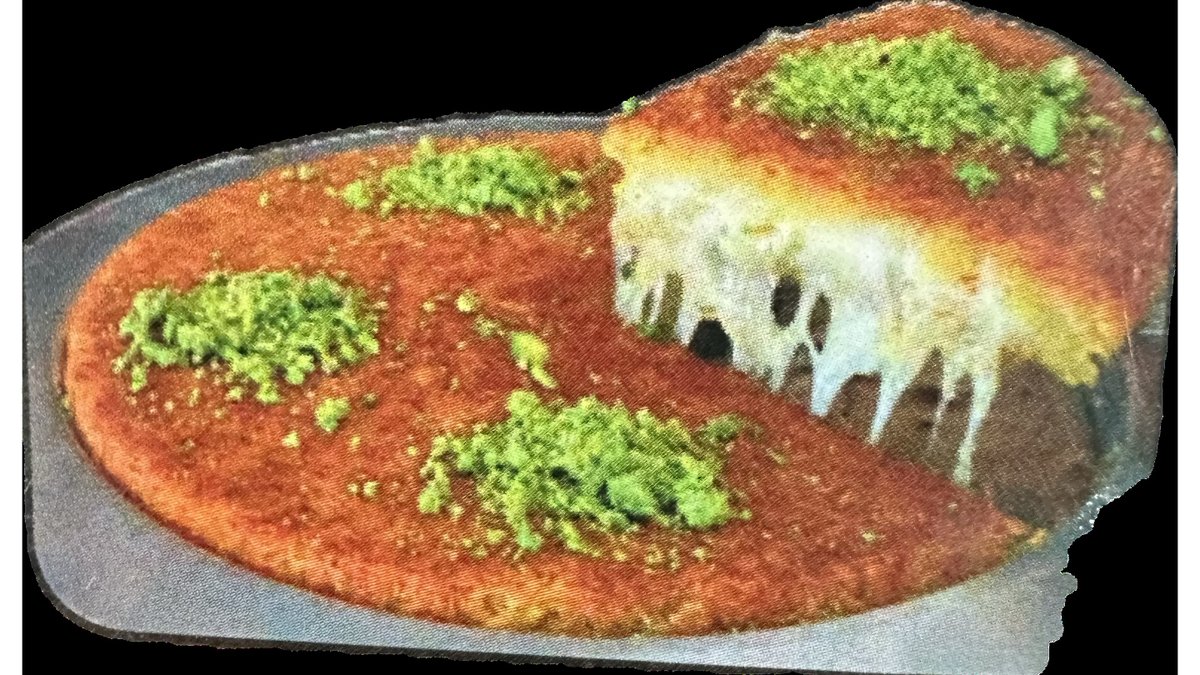 Sprød dessert med ostefyld og sød sukkerlage, toppet med pistacienødder.