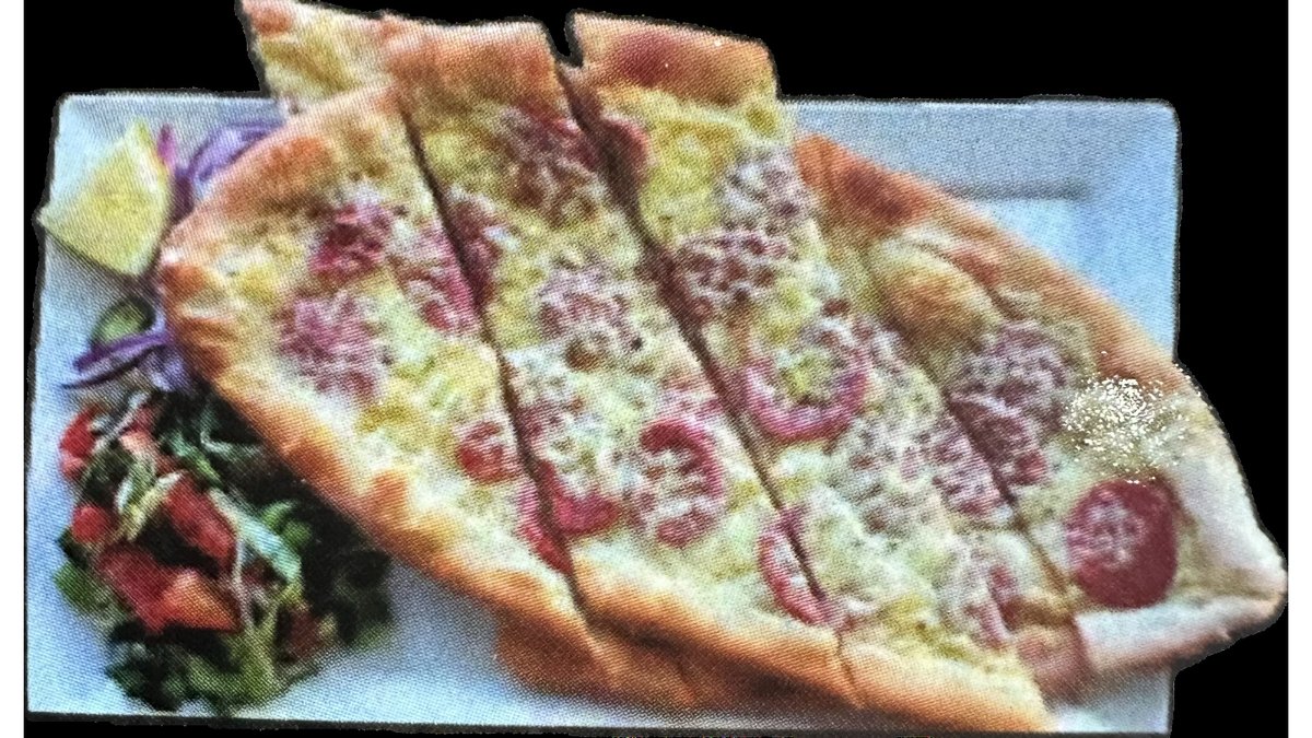 Fladbrød med krydret hakket oksekød, grøntsager og urter.