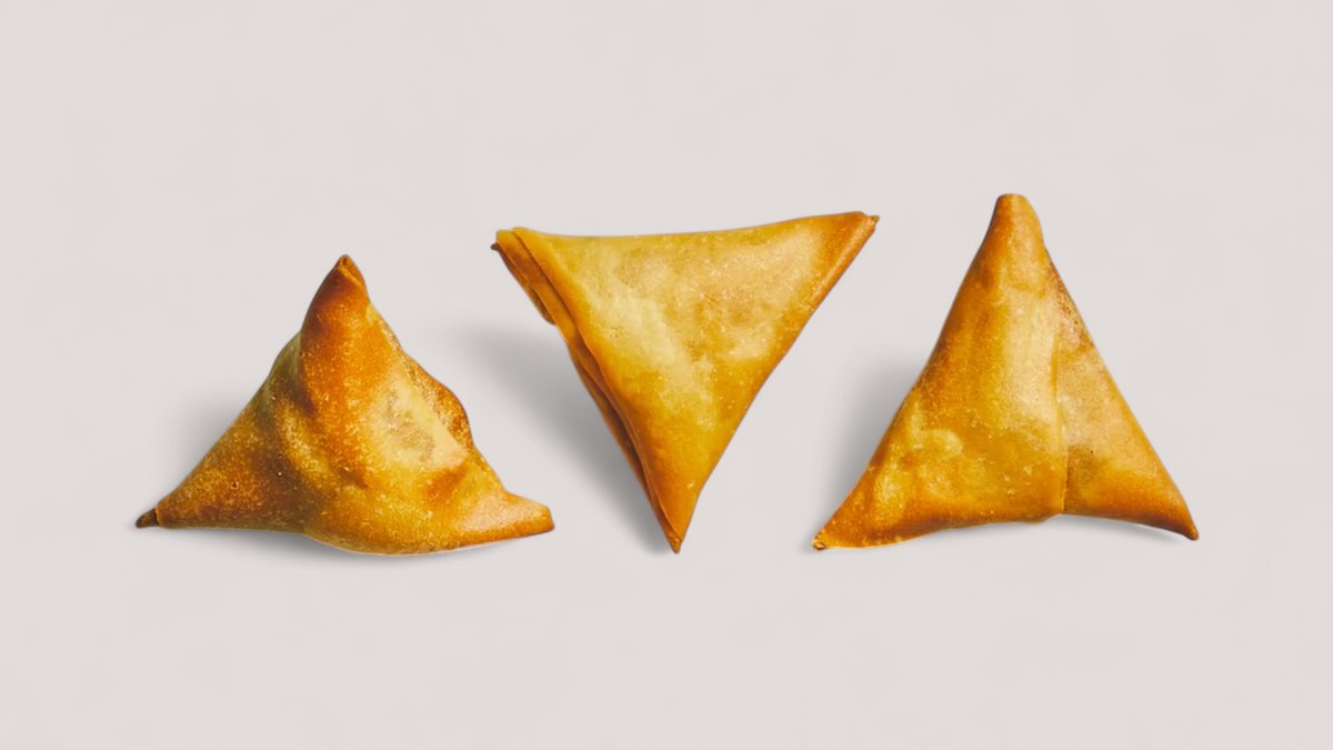 Sprøde samosa med mosede kartofler, ærter, gulerødder og krydderier.