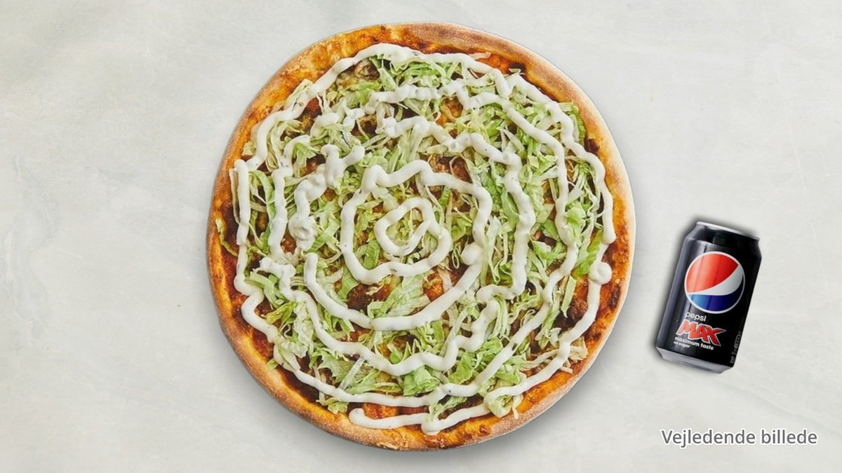 Tomat, ost, kebab, salat og dressing. Serveres med en Pepsi Max!