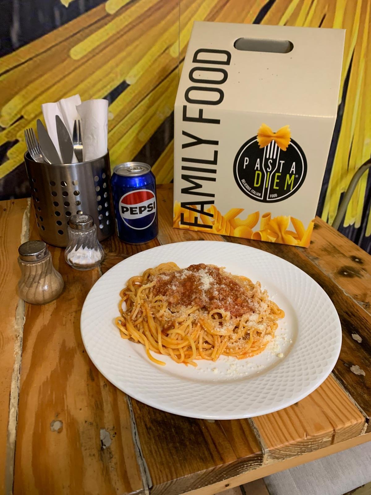 Spaghetti med Langtidskogt ragù. Serveres med valgfri 0,33 l sodavand.