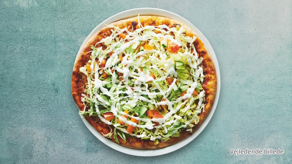 Kebab, salat, tomat, løg og dressing i hjemmelavet brød.