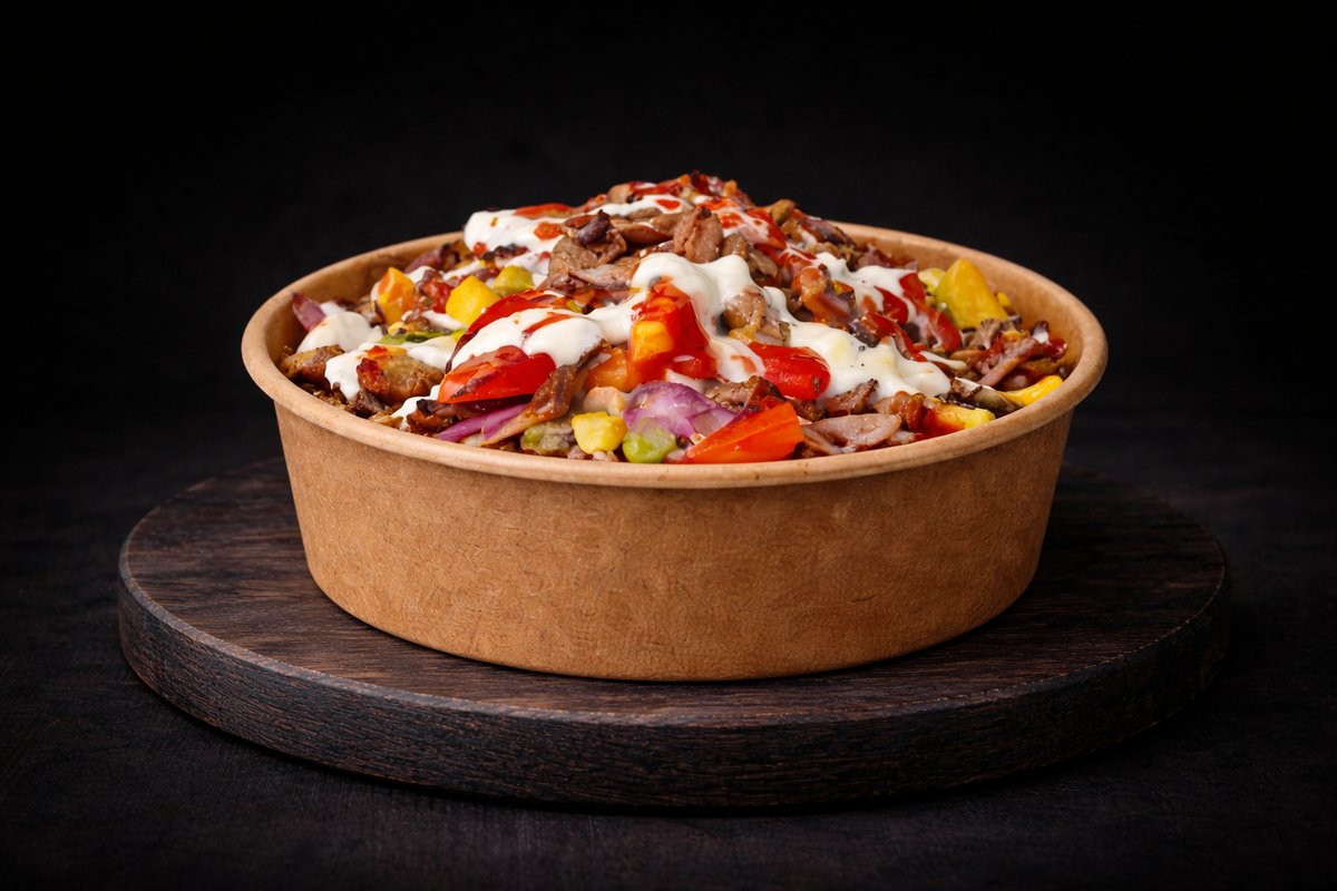 Box med fyld af krydret oksekød akkompagneret af udvalgte sides, salat og dressing.