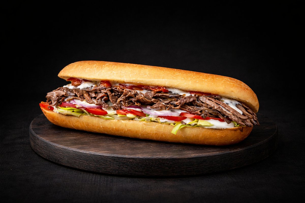 Oksekød serveret i vores signatur rullebrød, toppet med frisk salat og creme fraiche.
