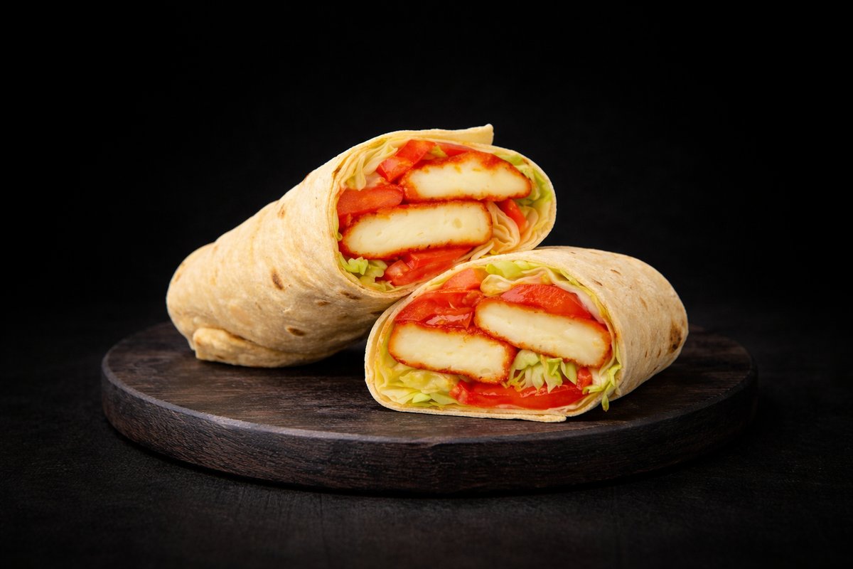 Halloumi sprødstegt til gylden perfektion og serveret i vores signatur rullebrød, toppet med frisk salat og creme fraiche.