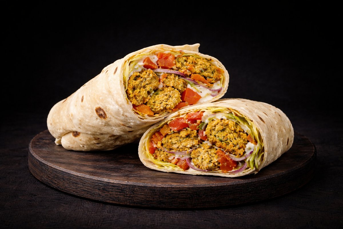 Hjemmelavet falafel, sprødstegt til perfektion og rullet ind i friskbagt signaturbrød, toppet med frisk salat og creme fraiche.