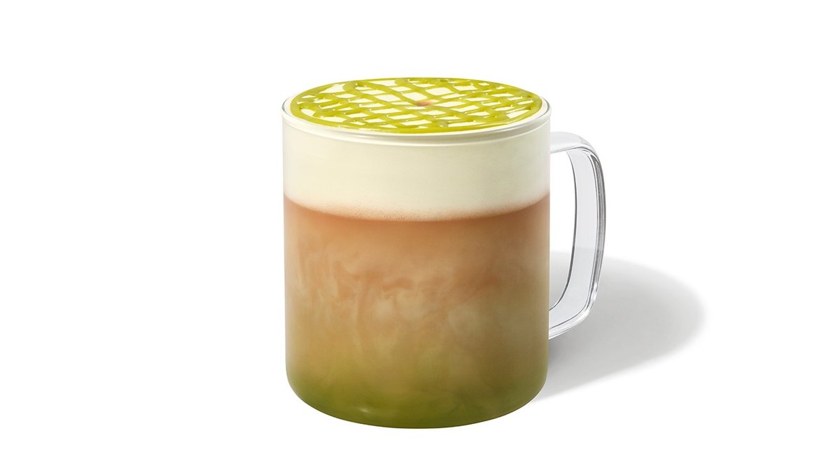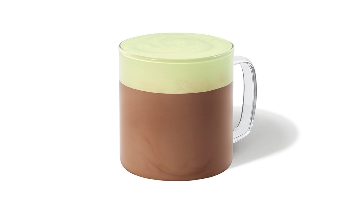 Bittersød mocha-sauce steamet med mælk, toppet med mælkeskum med pistaciesmag.