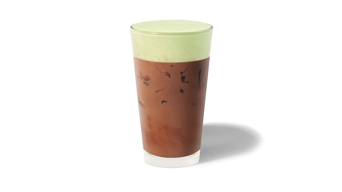 Bittersød mocha-sauce med mælk og isterninger, toppet med mælkeskum med pistaciesmag.