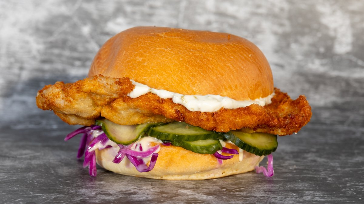 Sprødpaneret schnitzel af dansk gris, hurtig syltet rød spidskål og agurkesalat i briochebolle med “Dreng”-mayo og vores grisenaise