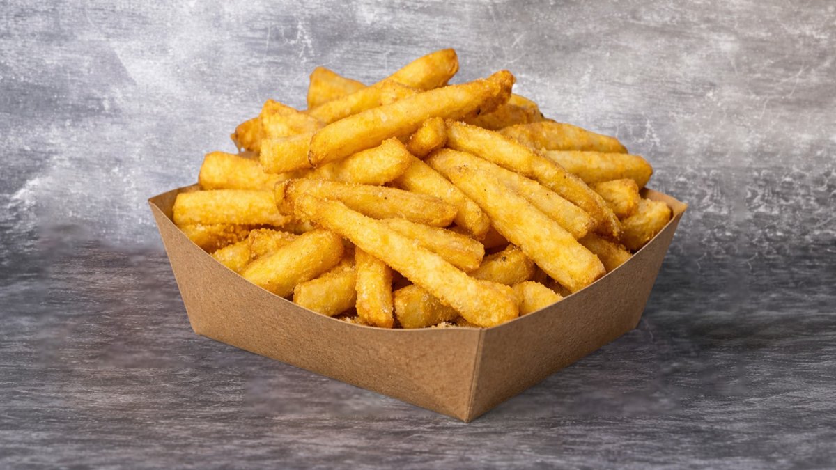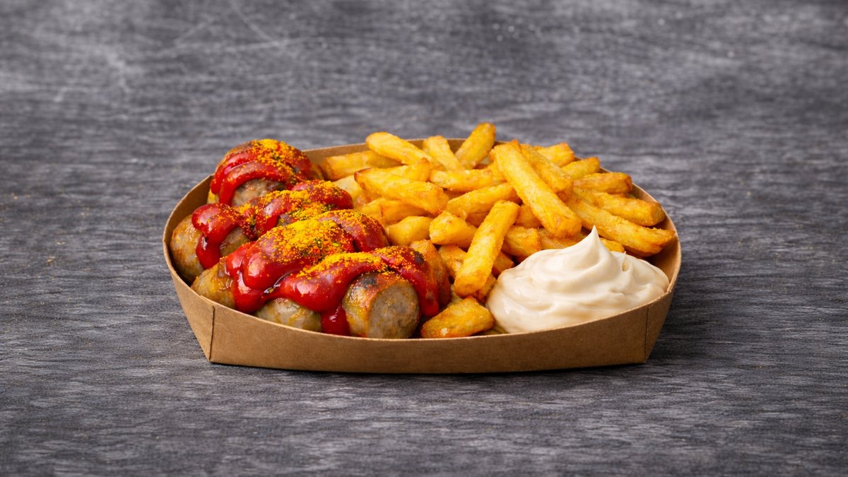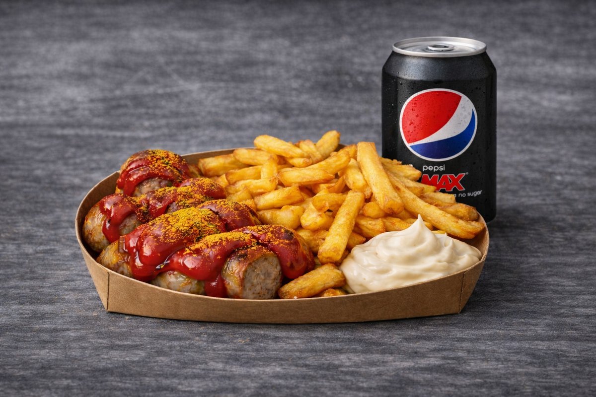 Currywurst med 2 Pølser, en kæmpe portion pomfritter og en valgfri sodavand.