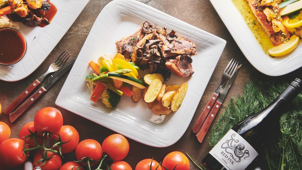 Ovnbagt laks med hvidløgsstegte tigerrejer og citron. Hertil valgfri kartofler og sauterede grøntsager.