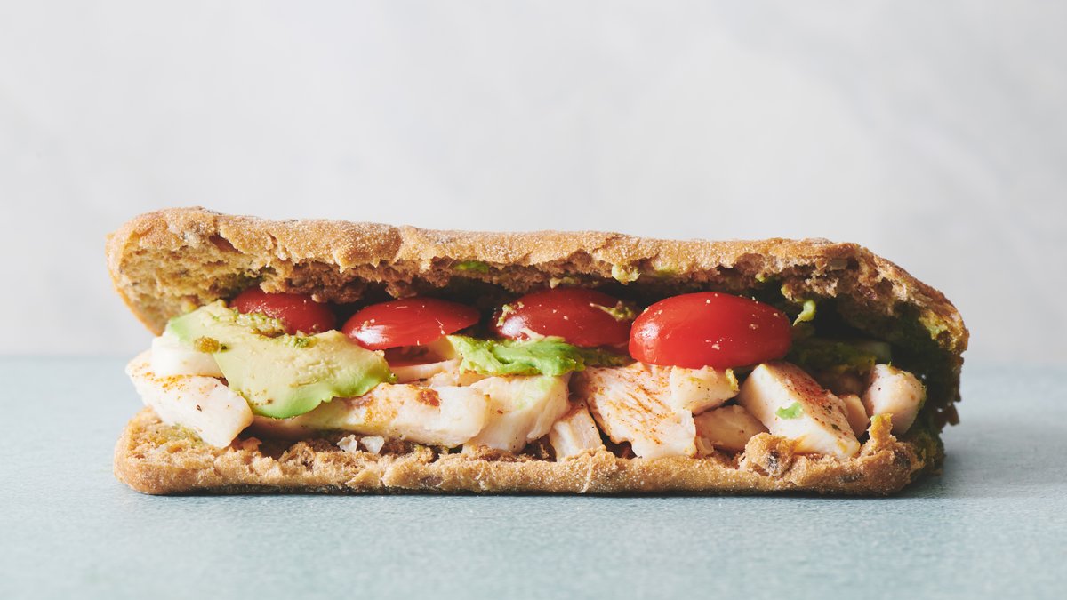 Kalkun, tun, mozarella, tomater, avocado, jalapeños, tabasco, sød chili dressing og pesto.