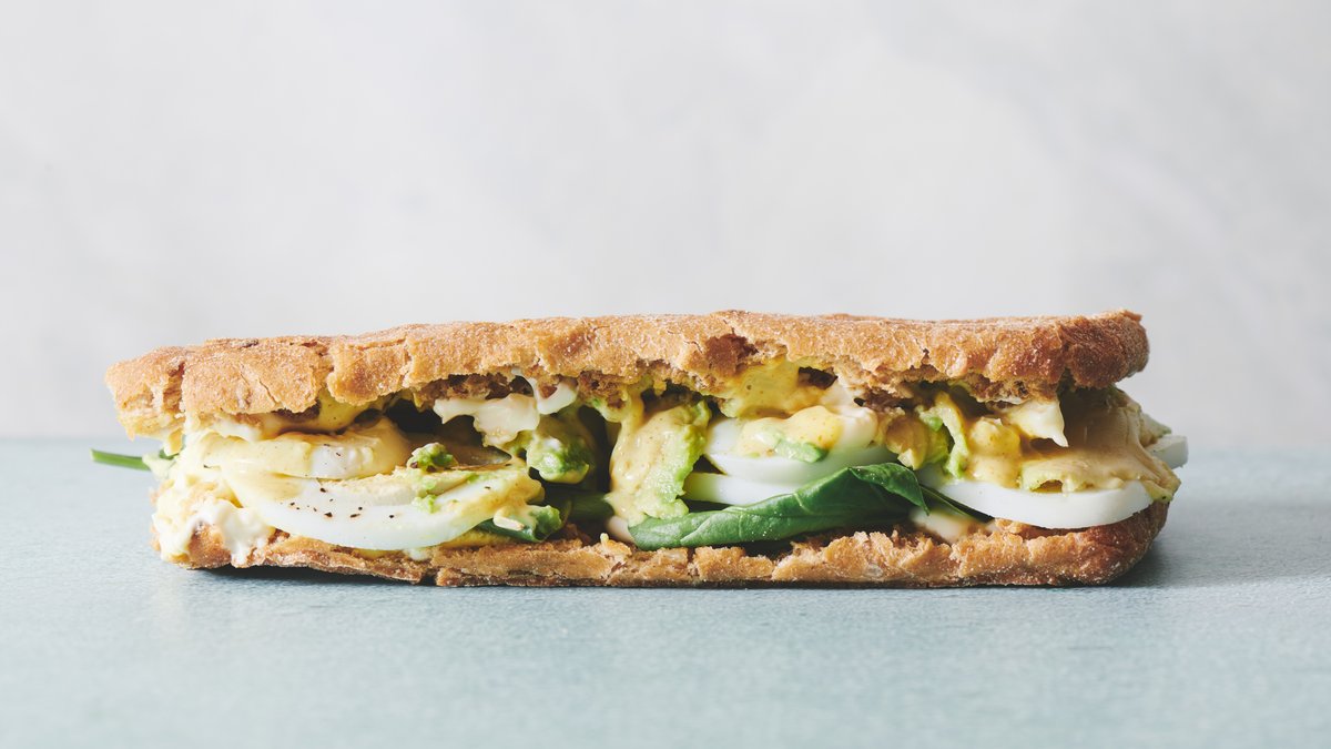 Tomat, avocado, mayonnaise, blandet salatmix med rucola og karrydressing.