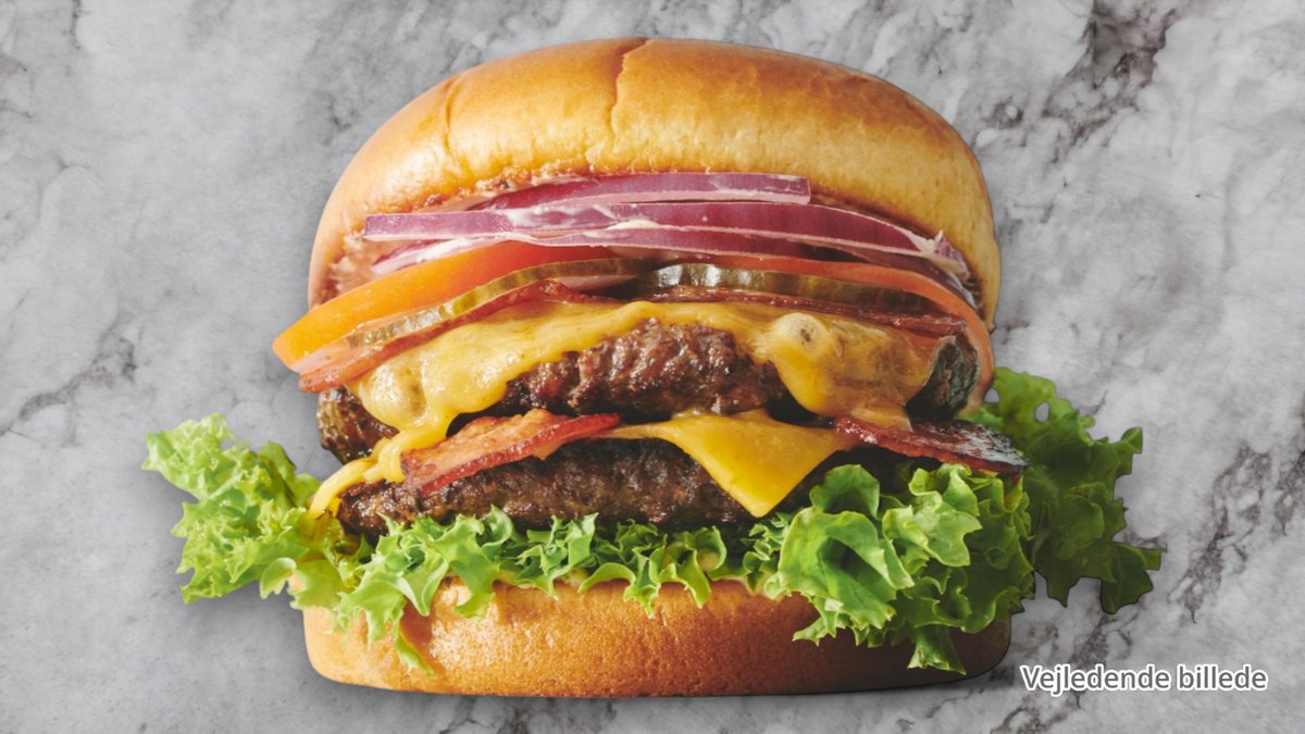 200 gram oksekøds bøf med bacon, Cibo salat, tomat, cheddar, syltede agurker i en bolle smurt med mayo og ketchup. Serveres med grovfritter.