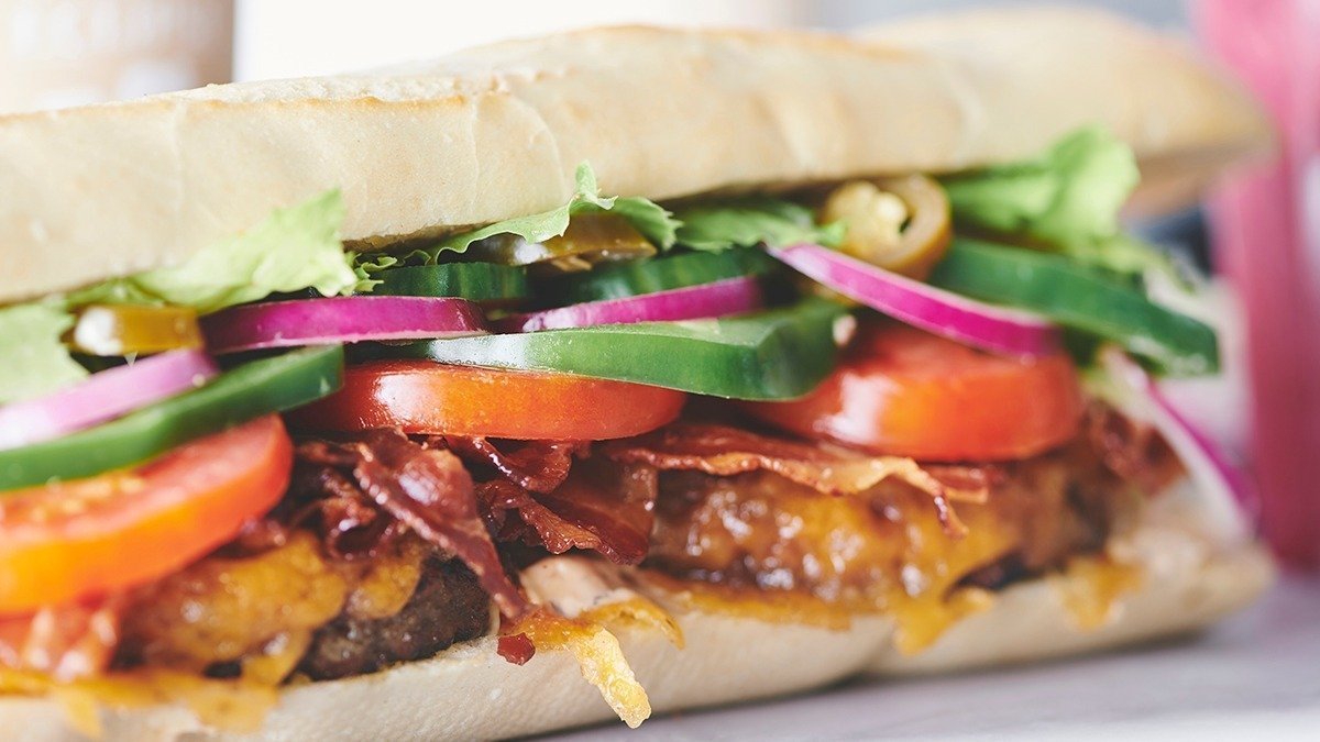 Valgfrit protein, eclipse dressing, tomat, jalapeños, pesto og cheddar i en toastet foccacia bolle.
