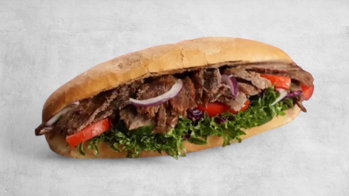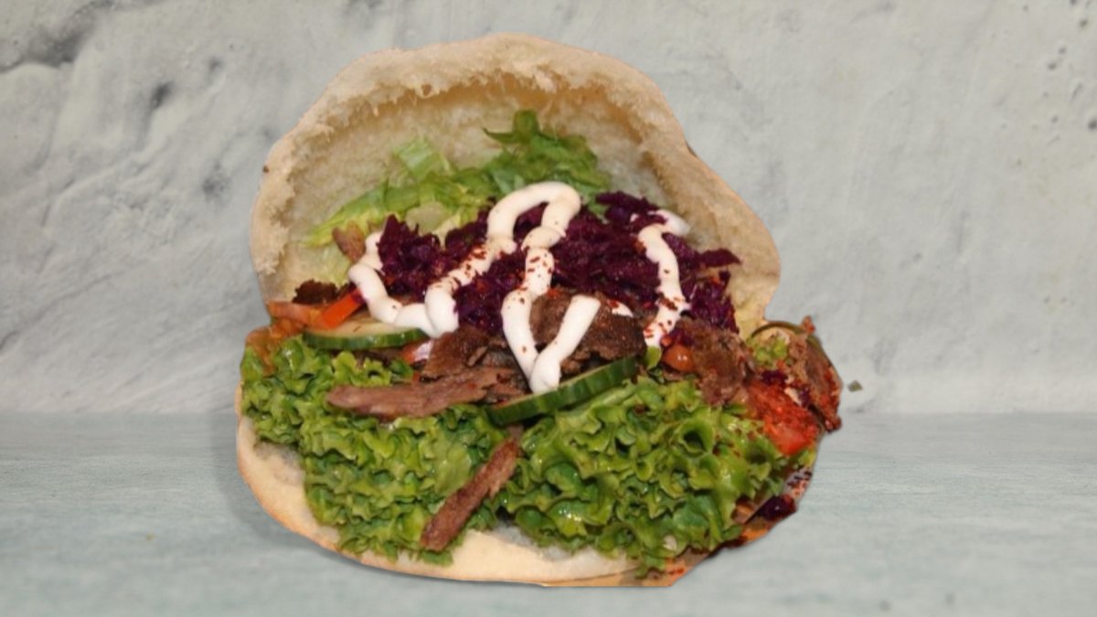 Tyrkisk brød med valgfrit protein, salat, tomat, agurk, løg og dressing.