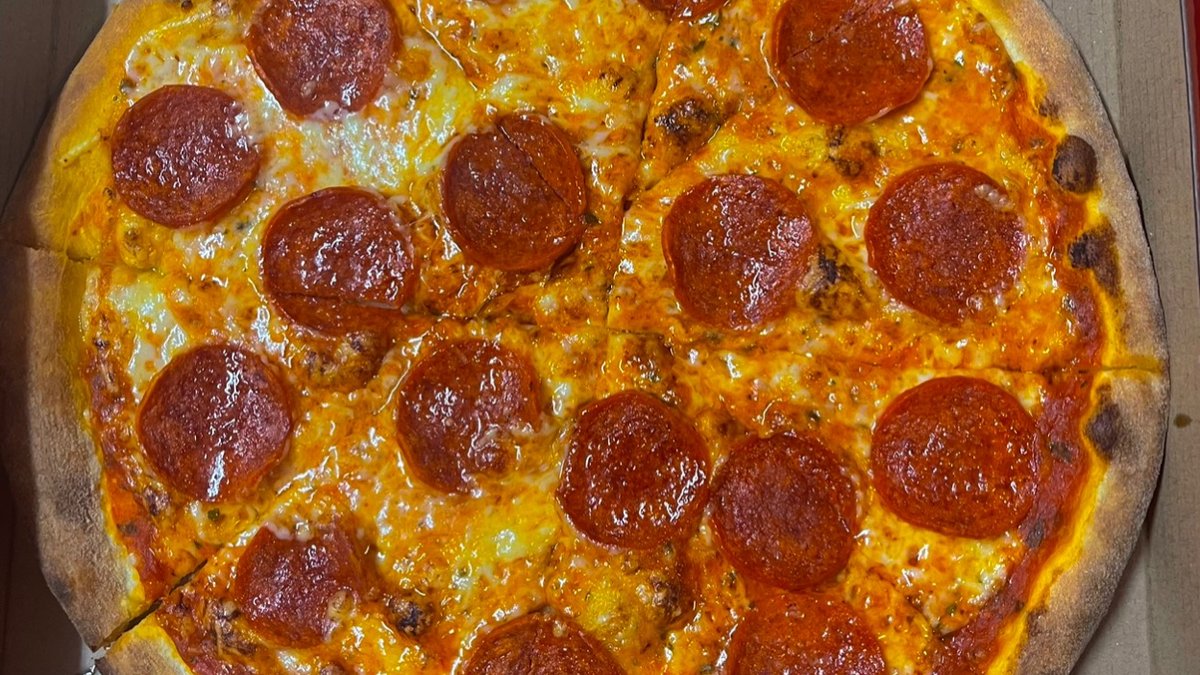 Tomatsauce, ost, pepperoni, løg, oliven, parmesan og oregano