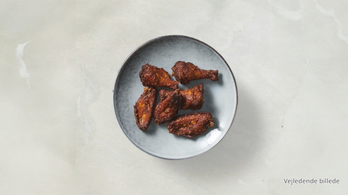 Halv grillkylling serveret med garniture og valgfrit tilbehør.