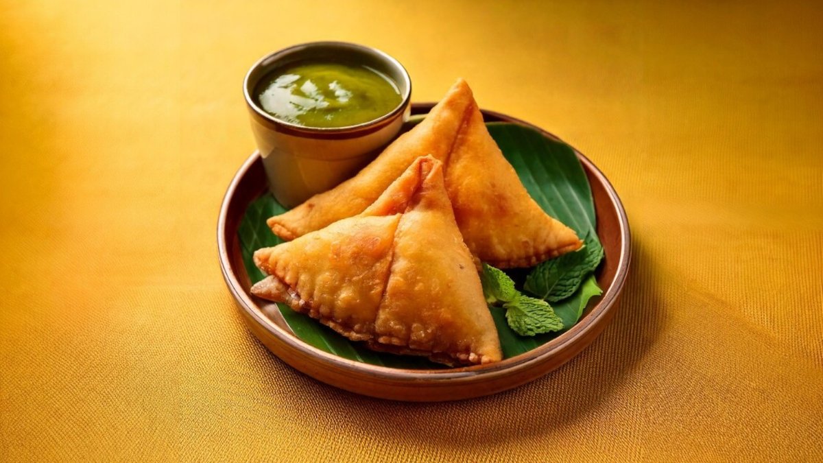 Sprøde trekanter fyldt med krydrede kartofler og ærter.