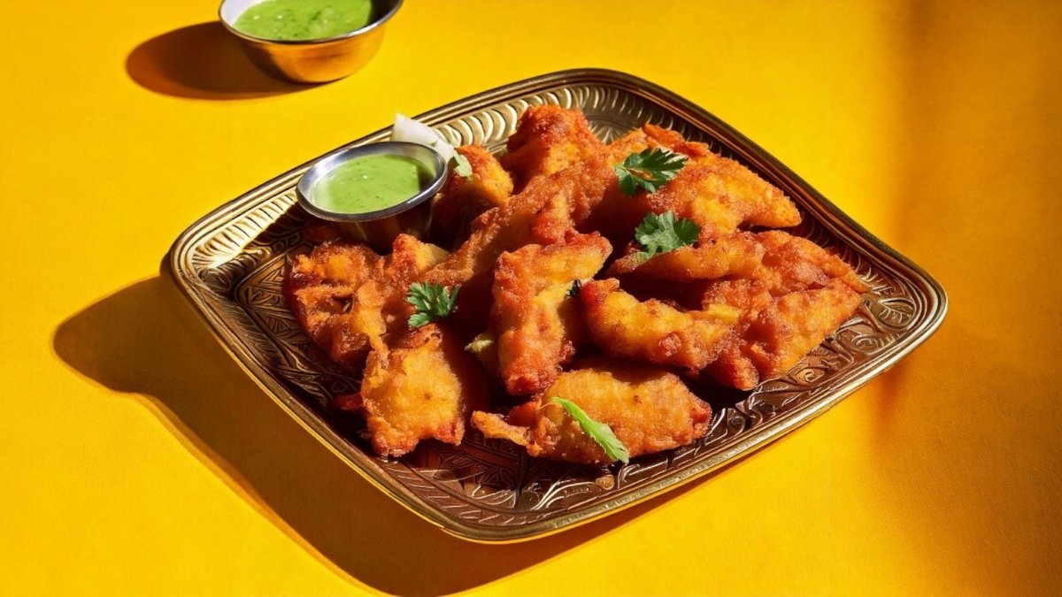Kartofler dyppet i krydret kikærtemel og friteret til gylden sprødhed.